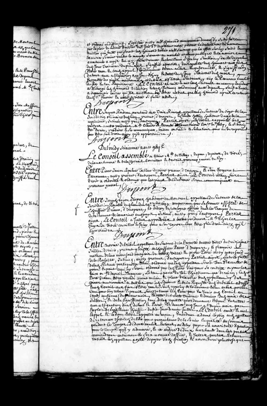- Transcription du texte avec orthographe modernisée : «Entre Antoine Debribal appelant de sentence de la prévôté de cette ville du troisième juillet dernier, présent assisté de l'huissier Prieur d'une part, et François Mathieu DELINO (De Lino) marchand bourgeois de cette dite ville et Pierre PEIRÉ aussi marchand de La Rochelle, intimés, aussi présents, d'autre part. Parties ouïes, lecture faite de ladite sentence par laquelle était ordonné que ledit appelant serait tenu d'exécuter de point en point ce qui lui serait ordonné par ledit Peiré soit pour sa conduite ou pour les lieux ou il devrait demeurer, le tout à peine de tel châtiment que de raison, ledit Peiré devant être regardé comme au lieu et place de la mère dudit appelant; des pièces mentionnées et datées par ladite sentence et de la requête dudit delribal adressée en ce dit Conseil aux fins d'être reçu en sondit appel, de l'ordonnance étant au bas portant tenu pour bien relevé et permis faire intimer ledit Peire pour en venir audit Conseil au lundi neuvième du présent mois, en date du trente et unième et dernier dudit mois de juillet, et de la signification tant de ladite requête qu'ordonnance étant ensuite avec assignation auxdits Delino (De Lino) et Peiré échéante audit jour 9e du présent mois par exploit de Lepallieur huissier dudit jour dernier juillet. Le Conseil a mis et met l'appel et ce dont était appelé au néant, émendant a donné l'option audit appelant de retourner chez ledit Delino (De Lino) pour parachever de le servir en qualité de commis pendant le temps de deux années entières, ou de lui payer sa nourriture et pension pour le temps qu'il y a demeuré, et ce au dire de deux marchands dont les parties conviendront autrement en sera nommé d'office, et icelles parties étant rentrées ledit appelant a opté de payer sa dite pension et nourriture plutôt que de retourner au service dudit Delino (De Lino) et pour cet effet ont nommé savoir ledit Delino (De Lino) Charles Macard marchand bourgeois de cette dite ville et par ledit delribal Nicolas Pinau (Pineau) marchand bourgeois de cette dite ville pour estimer lesdits pension et nourriture, lesquelles seront payées et avancées pour ledit appelant par ledit Peiré, sauf son recours contre la mère d'icelui dit appelant pour son remboursement, et ledit delribal condammé aux dépens qui seront pareillement avancés par ledit Peiré. DUPONT.»