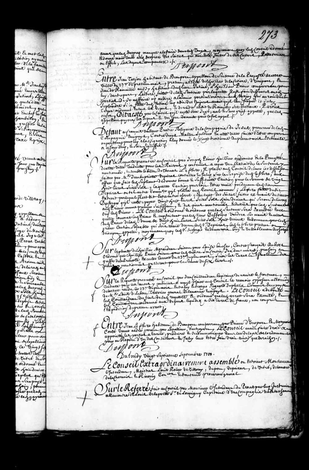 - Transcription du texte avec orthographe modernisée : «Sur la requête présentée au Conseil par Joseph Prieur huissier audiencier en la prévôté de cette ville tendante pour les raisons y contenues à ce que vu l'extrait de la sentence y mentionnée, ensemble le billet de Thomas Lefebvre, il plaise au Conseil de lever les défenses faites par maître Jean-Baptiste Depeiras conseiller en icelui sur la surprise dudit Lefebvre, aux offres que fait ledit suppliant de donner bonne et suffisante caution pour la somme de vingt-huit livres seize sols, laquelle caution pourrait être reçue par-devant ledit sieur Depeiras ou tel autre commissaire qu'il plaira audit Conseil nommer, lecture faite dudit extrait par lequel il est dit entre autres choses qu'au sujet des saisies faites en les mains du sieur Desforges qu'il reste à payer vingt-huit livres seize sols huit deniers qui seront délivrés audit Prieur comme premier saisissant, et des pièces mentionnées et datées par ladite sentence ouï ledit Prieur. Le Conseil a ordonné et ordonne que ladite sentence sera exécutée en ce qu'elle concerne ledit Prieur et en ce faisant que ledit sieur Desforges videra ses mains en celles dudit Prieur de ladite somme de vingt-huit livres seize sols huit deniers en donnant par ledit Prieur caution solvable qui sera reçue devant ledit sieur Depeiras, ledit Lefebvre présent ou dûment appelé, moyennant quoi ledit sieur desforges en demeurera bien et valablement déchargé. DUPONT.»