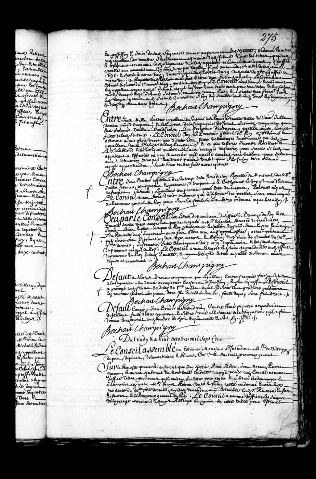Transcription du texte avec orthographe modernisée : «Entre Denis MALLET sculpteur appelant de sentence de la prévôté de cette ville du dixième juillet dernier présent d'une part. Et les pères de la compagnie de Jésus intimés comparant pour eux François Vaillant l'un d'iceux, leur procureur d'autre part. Parties ouïes, lecture faite de ladite sentence. Le Conseil ouï le procureur général du Roi a ordonné et ordonne avant faire droit que visite sera faite de l'ouvrage en commencé par ledit appelant dans l'église de ladite compagnie et ce par le père Juconde récollet et le sieur Leblond ecclésiastique connaissant aux ouvrages en question pour savoir si ledit appelant a effectué ou non le marché qu'il a passé avec ledit père Vaillant pour de leur avis et estimation être par eux dressé procès-verbal pour sur icelui être ordonné ce qu'il appartiendra, sans tirer toutes fois a conséquence. BOCHART CHAMPIGNY.»