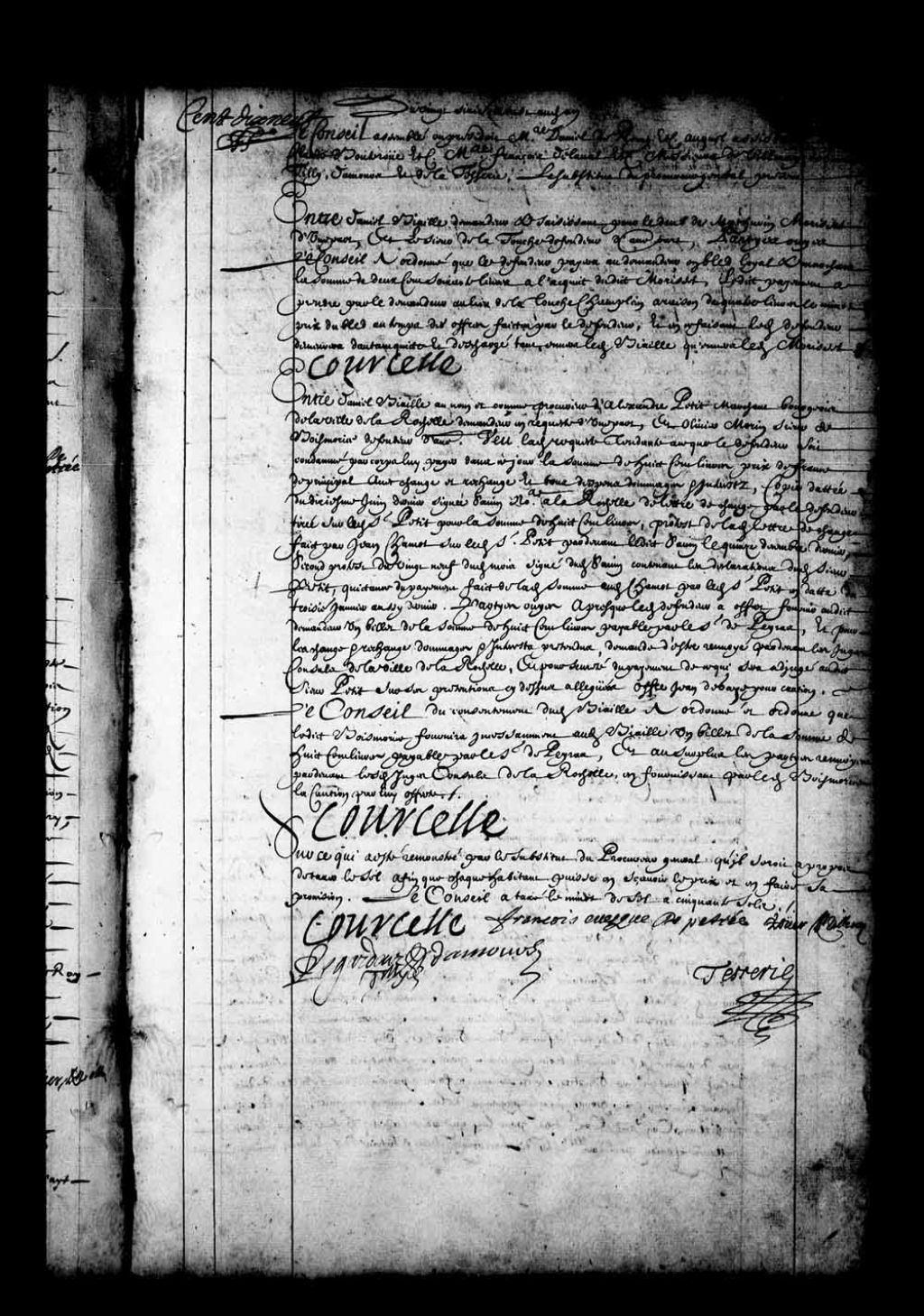 Transcription du texte avec orthographe modernisée : «Du vingt-sixième août audit an. Le Conseil assemblé où présidait messire Daniel de Rémy etc, auquel assistaient messire Claude de Bouteroue etc. messire François de Laval etc. messieurs de Villeray, de Gorribon, Tilly, Damours et de la Tesserie le substitut du procureur général présent.»
