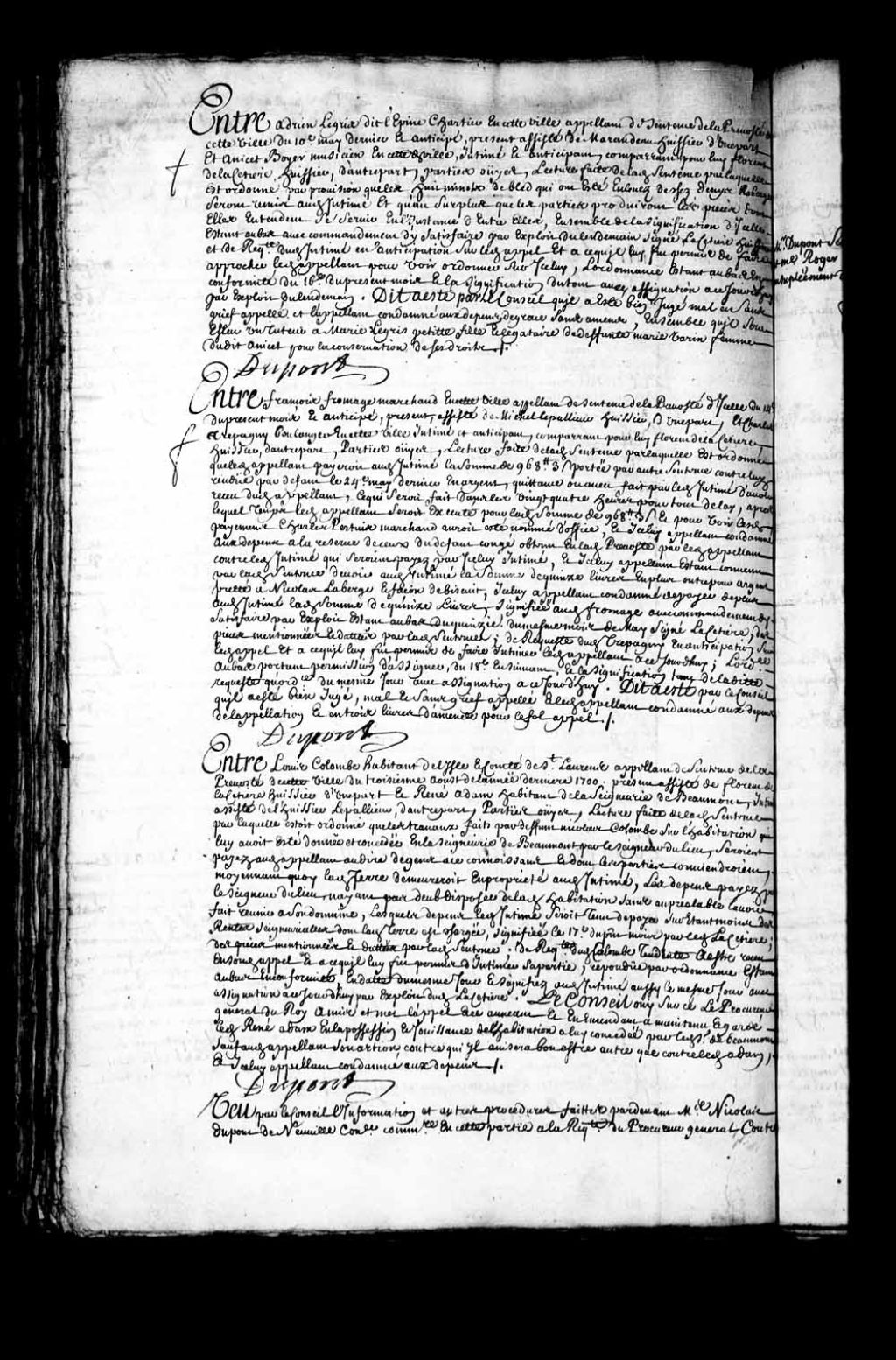 Transcription du texte avec orthographe modernisée : «Entre François FROMAGE marchand en cette ville appelant de sentence de la prévôté d'icelle du 14e du présent mois et anticipé, présent, assisté de Michel Lepallieur huissier, d'une part, et Charles TREPAGNY (Trépanier) boulanger en cette ville intimé et anticipant, comparant pour lui Florent de LaCetière huissier, d'autre part. Parties ouïes, lecture faite de ladite sentence par laquelle est ordonné que ledit appelant payerait audit intimé la somme de 968 livres 3 sols portée par autre sentence contre lui rendue par défaut le 24e mai dernier en argent, quittance ou aveu fait par ledit intimé d'avoir reçu dudit appelant, ce qui serait fait dans les vingt-quatre heures pour tout délai, après lequel temps ledit appelant serait exécuté pour ladite somme de 968 livres 3 sols, et pour voir lesdits payements Charles Pertuis (Perthuis) marchand aurait été nommé d'office, et icelui appelant condamné aux dépens à la réserve de ceux du défaut congé obtenu en ladite prévôté par ledit appelant contre ledit intimé qui seraient payés par icelui intimé, et icelui appelant étant convenu par ladite sentence devoir audit intimé la somme de quinze livres en plus outre pour argent prêté à Nicolas Laberge et façon de biscuit, icelui appelant condamné de payer de plus audit intimé ladite somme de quinze livres, signifiée audit Fromage avec commandement d'y satisfaire par exploit étant au bas du quinzième du même mois de mai signé LaCetière, des pièces mentionnées et datées par ladite sentence; de requête dudit Trepagny en anticipation sur ledit appel et à ce qu'il lui fut permis de faire intimer ledit appelant à ce jourd'hui; l'ordonnance au bas portant permission d'assigner, du 18e ensuivant, et la signification tant de ladite requête qu'ordonnance du même jour avec assignation à ce jourd'hui. Dit a été par le Conseil qu'il a été bien jugé, mal et sans grief appelé et ledit appelant condamné aux dépens de l'appellation et en trois livres d'amende pour le fol appel. DUPONT.»