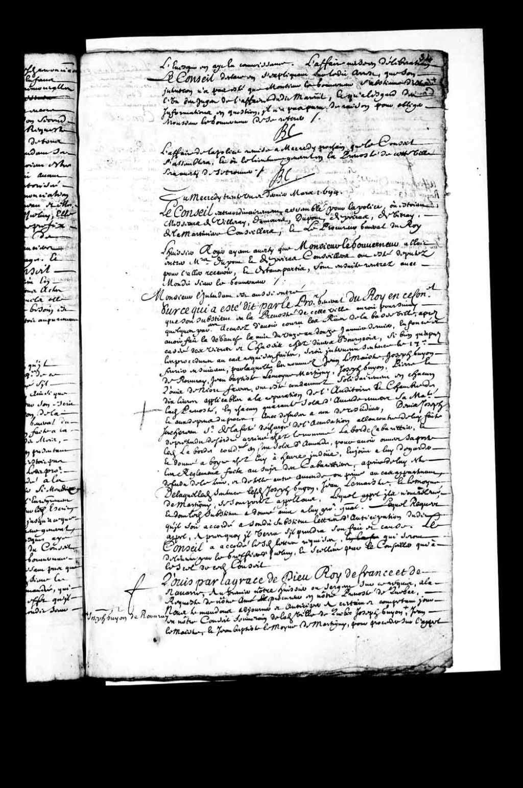 - Transcription du texte avec orthographe modernisée : «Louis par la grâce de Dieu Roi de France et de Navarre, au premier notre huissier ou sergent sur ce requis, à la requête de notre aimé procureur en notre prévôté de Québec, nous te mandons ajourner et anticiper à certain et compétent jour en notre Conseil souverain de ladite ville de Québec, Joseph Guyon, Joseph Guyon de Rouvray, Jean Lemaistre et Jean-Baptiste Lemoyne (Lemoine) de Martigny pour procéder sur l'appel par eux interjeté de la sentence contre eux rendue par le lieutenant général en ladite prévôté le 17e février dernier, et procéder en outre comme de raison, de ce faire te donnons pouvoir, car tel est notre plaisir. Donné en ladite ville de Québec sous le sceau de notre dit Conseil le dernier jour de mars l'an de grâce mille six cent quatre-vingt-quatorze et de notre règne le cinquantième. BOCHART CHAMPIGNY.»