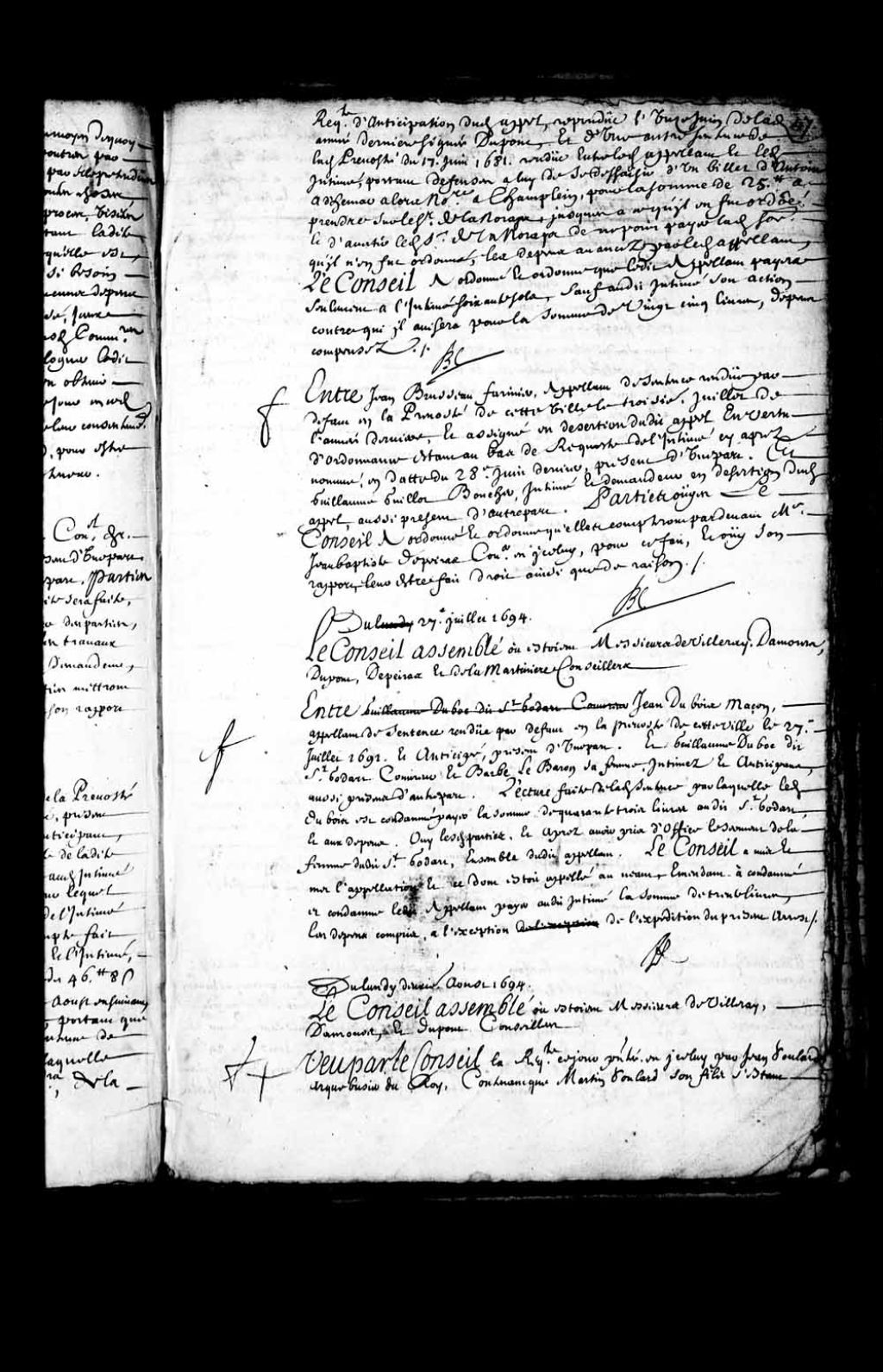 Ordre aux parties, Jean Brusseau (Brousseau), farinier, et Guillaume Guillot, boucher, de compter par-devant Me Jean-Baptiste de Peiras, 19 juillet 1694, Archives nationales à Québec, Fonds Conseil souverain, (03Q,TP1,S28,P7005).