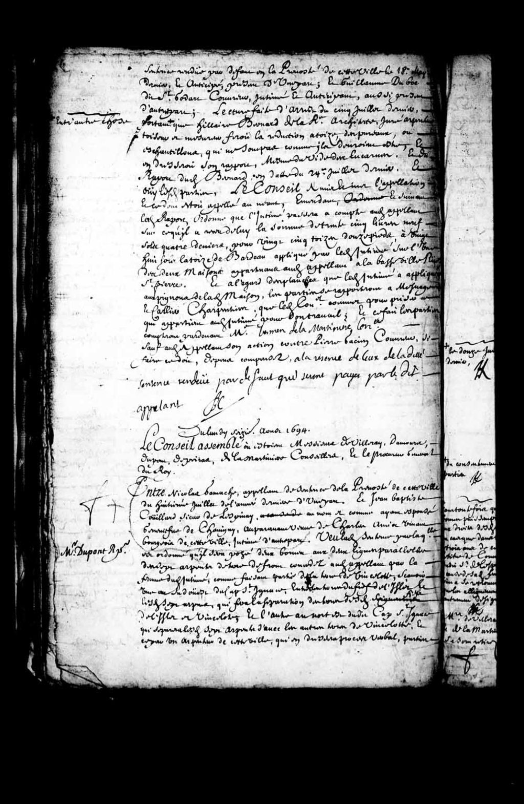 - Transcription du texte avec orthographe modernisée : «Entre maître Nicolas DUPONT de NEUVILLE conseiller en ce Conseil appelant de sentence rendue par défaut en la prévôté de cette ville le dix-huit mai dernier, et anticipé, présent d'une part, et Guillaume Duboc dit Saint-Godart (Saint-Godard) couvreur, intimé et anticipant aussi présent d'autre part, lecture faite d'arrêt du cinq juillet dernier, portant entre autres choses que Hilaire Bernard de la Rivière (Larivière) architecte juré arpenteur toiseur et mesureur ferait la réduction a toise des pureaux, ou échantillons qui ne sont pas comme ils devraient être, et en dresserait son rapport, même du vide des lucarnes, et du rapport dudit Bernard en date du vingt-quatre juillet dernier, et ouï lesdites parties, le Conseil a mis et met l'appellation et ce dont était appelé au néant, émendant et suivant ledit rapport, ordonné que l'intimé passera à compte audit appelant, sur ce qu'il a [...]