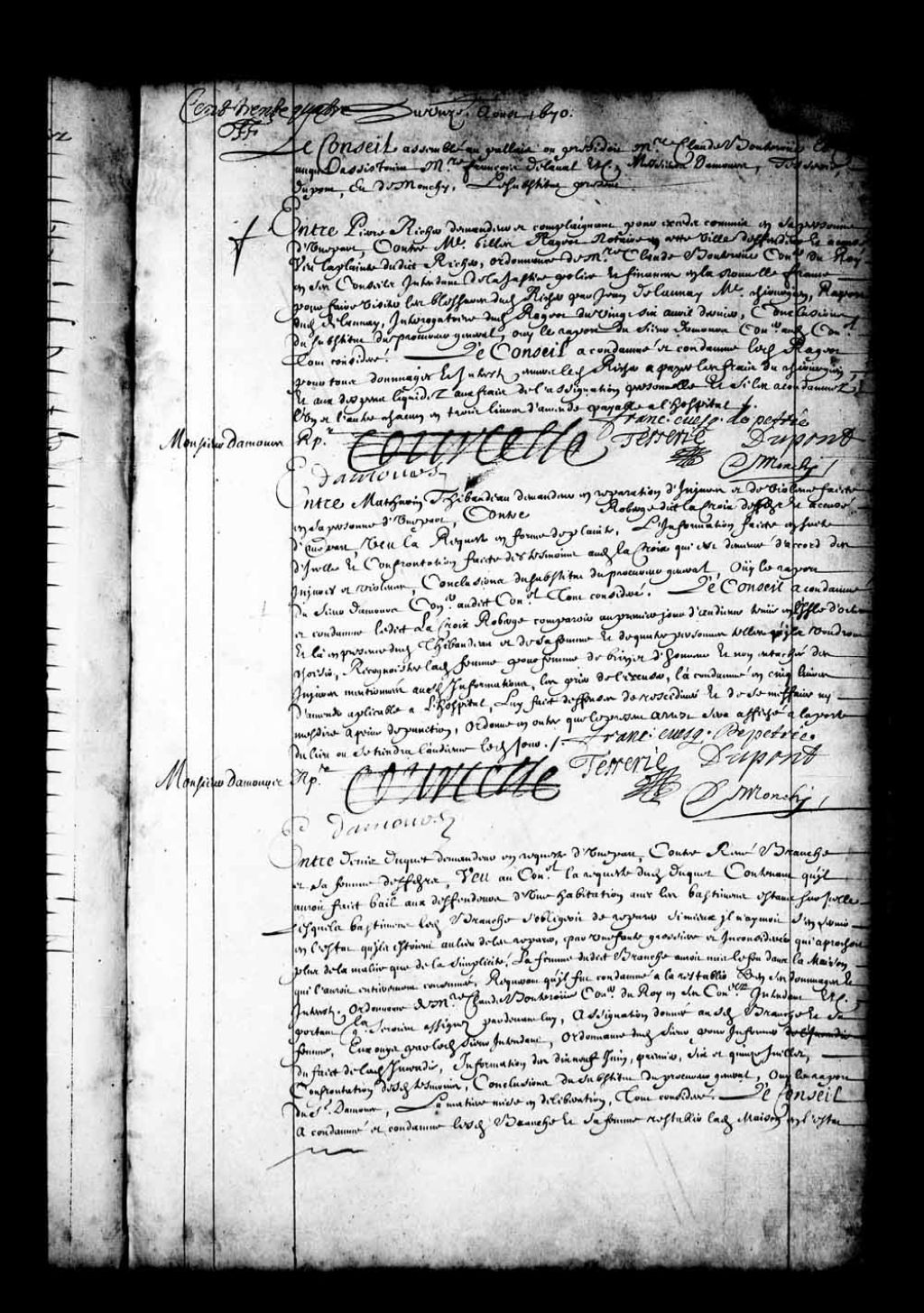- Transcription du texte avec orthographe modernisée : «Du onzième août, 1670. Le Conseil assemblé au palais ou présidait messire Claude Bouteroue etc, auquel assistaient messire François de Laval etc. messieurs Damours, Tesserie, Dupont, et de Mouchy, le substitut présent. Entre Pierre RICHER demandeur et complaignants pour excès commis en sa personne d'une part, contre maître Gilles Rageot notaire en cette ville, défendeur et accusé; vu la plainte dudit Richer, ordonnance de messire Claude Bouteroue conseiller du Roi en ses Conseils intendant de la justice police et finances en la Nouvelle-France, pour faire visiter les blessures dudit Richer par Jean de Launay (Delaunay) maître chirurgien; rapport dudit de Launay; interrogatoire dudit Rageot du vingt-six avril dernier; conclusions du substitut du procureur général; ouï le rapport du sieur Damours conseiller audit Conseil, tout considéré, le Conseil a condamné et condamne ledit Rageot pour tous dommages et intérêts envers ledit Richer à payer les frais du chirurgien et aux dépens liquidés aux frais de l'assignation personnelle et si les a condamnés l'un et l'autre chacun en trois livres d'amende payable à l'hôpital. Monsieur Damours rapporteur. DAMOURS, FRANÇOIS évêque de petrée, TESSERIE DUPONT, DEMOUCHY.»