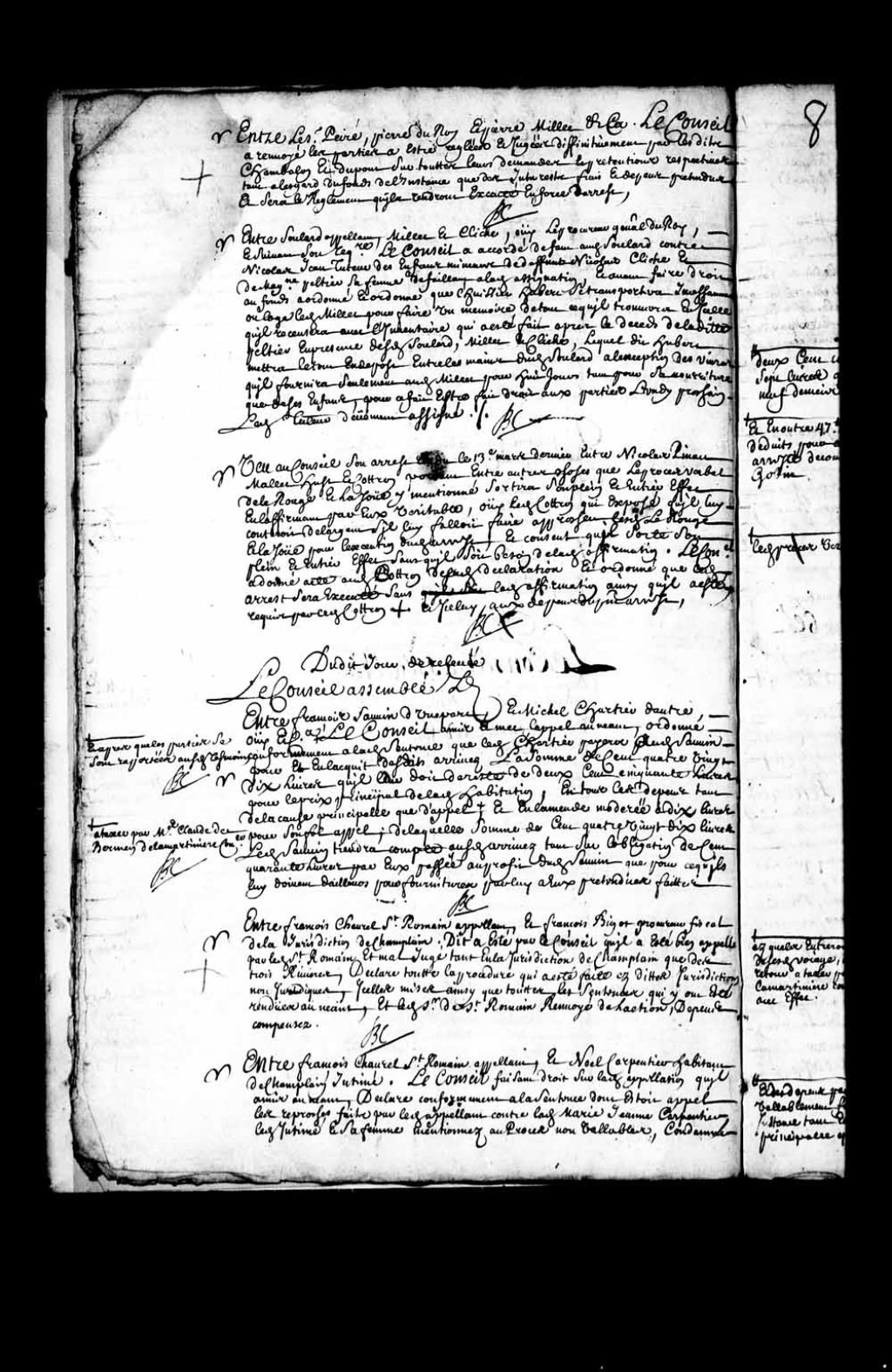- Transcription du texte avec orthographe modernisée : «Entre Jean SOULARD arquebusier du Roi en cette ville appelant de sentence de la prévôté d'icelle du 27e mars dernier présent, d'une part, et Pierre MILLET (Millier) cabaretier et (...) CLICHE mineur et menuisier en cette dite ville d'autre part, lecture faite de ladite sentence et de l'assignation étant au bas donnée à la requête dudit Soulard tant audit Millet qu'à Nicolas Jean tant en son nom comme ayant épousé Françoise Cliche que comme tuteur des enfants mineurs de défunt Nicolas Cliche et de Marie Madeleine Pelletier, le quinzième du présent mois, ouï lesdits Millet Soulard et Cliche, ensemble le procureur général du Roi. Le Conseil a accordé défaut audit Soulard contre ledit Nicolas Jean tuteur des enfants mineurs, défaillant à ladite assignation, et avant faire droit au fonds a ordonné et ordonne que l'huissier Hubert se transportera incessamment en la maison ou loge ledit Millet pour faire un mémoire de tout ce qu'il trouvera en icelle qu'il recensera avec l'inventaire qui a été fait après le décès de ladite Pelletier en présence desdits Soulard Millet et Cliche, lequeldit Hubert mettra le tout en dépôt entre les mains dudit Soulard, à l'exception des vivres qu'il fournira seulement audit millet pour huit jours tant pour sa nourriture que de celle de ses enfant, pour ce fait être ordonné lundi prochain ce que de raison ledit tuteur dûment assigné. BOCHART CHAMPIGNY.»