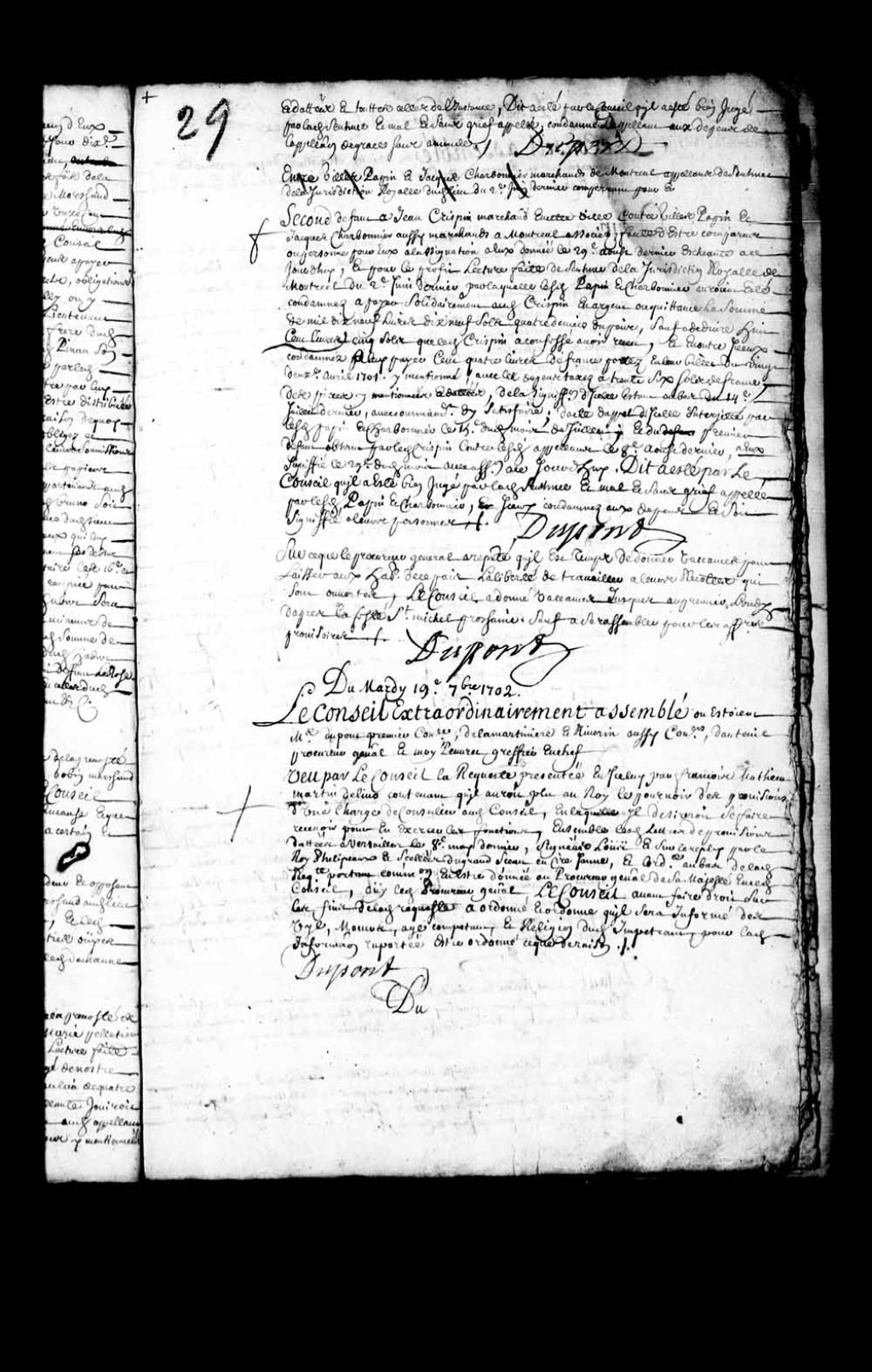 Transcription du texte avec orthographe modernisée : «Du mardi 19e septembre 1702. Le Conseil extraordinairement assemblé où étaient maître Dupont premier conseiller, de La Martinière et Riverin aussi conseillers, d'Auteuil procureur général et moi Peuvret greffier en chef. Vu par le Conseil la requête présentée en icelui par François Mathieu Martin Delino (De Lino) contenant qu'il aurait plu au Roi le pourvoir des provisions d'une charge de conseiller audit Conseil, et laquelle il désirerait se faire recevoir pour en exercer les fonctions, ensemble lesdites lettres de provisions datées à Versailles le 8e mai dernier, signées Louis et sur le repli par le Roi Phelipeaux et scellées du grand sceau en cire jaune, et l'ordonnance au bas de ladite requête portant commission en être donnée au procureur général de sa Majesté en ce dit Conseil, ouï ledit procureur général, le Conseil avant faire droit sur les fins de ladite requête a ordonné et ordonne qu'il sera informé des vie, moeurs, âge compétent, et religion dudit impétrant pour ladite information rapportée être ordonné ce que de raison. DUPONT.»