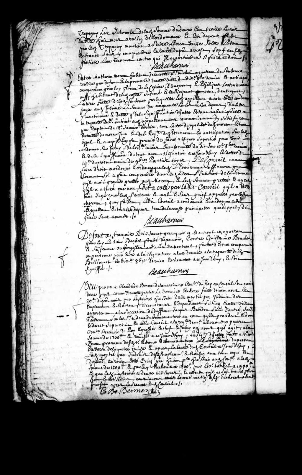 - Transcription du texte avec orthographe modernisée : «Vu par nous Claude de Bermen de La Martinière conseiller du Roi au Conseil souverain de ce pays commissaire en cette partie la dernière enchère faite devant nous le 20e du présent mois par LaCetière huissier de la moitié par indivis des emplacement et maison, circonstances et dépendances situés en cette ville appartenant à la succession de défunt Jacques Bourdon sieur dautré (D'Autray) saisis réellement sur les sieur et dame de Bonaventure au nom qu'ils procèdent et dont le décret se poursuit en ce dit Conseil à la requête de maître Alexandre Peuvret conseiller secrétaire du Roi et greffier en chef en icelui aux noms qu'il agit, à la somme de 1700 livres et remise à ce jourd'hui; la signification d'icelle faite à Nicolas Pinau (Pineau, Pinault) procureur desdits sieur et dame de Bonaventure le 22e du présent, en vertu de laquelle remise et après la levée dudit Conseil ce jourd'hui, ladite moitié par indivis desdits emplacement et maison avec tout ce qui en dépend, auraient été criés par Hubert premier huissier audit Conseil à ladite somme de 1700 livres et par lui enchéris a 1800 livres par le sieur Barbel a 1900 livres et par ledit LaCetière à deux mille livres, et attendu qu'il ne s'est trouvé plus haut enchérisseurs, nous avons remis la continuation desdites enchères à lundi prochain après la séance dudit Conseil. C. DE BERMEN»