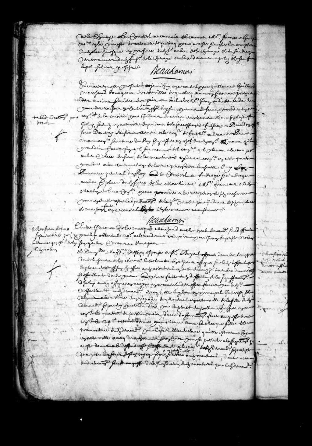 - Transcription du texte avec orthographe modernisée : «Sur la requête présentée ce jourd'hui en ce conseil par Guillaume Gaillard marchand bourgeois de cette ville de Québec au nom et comme procureur des anciens fermiers de ce pays au bail de maître Jean Oudiette tendante pour les raisons y contenues à ce qu'il lui fut permis de faire procéder en ce Conseil a l'adjudication par décret de la moitié par indivis de certain emplacement et maison bâtie sur icelui, situés en cette ville dépendant de la succession de feu Jacques Bourdon écuyer sieur Dautray (D'Autray) saisis réellement à la requête de feu maître Alexandre Peuvret vivant conseiller secrétaire du Roi et greffier en chef de ce dit Conseil au nom qu'il procédait et à cette fin qu'il fût nommé tel conseiller qu'il plairait à la cour pour au lieu et place du sieur de La Martinière ci-devant conseiller en cette partie procéder à la continuation de la réception des enchères. Ouï le procureur général du Roi. Le Conseil a subrogé et subroge au lieu et place dudit sieur de La Martinière maître François Mathieu Martin Delino (De Lino) conseiller pour procéder à la réception desdites enchères pour ensuite être l'adjudication de ladite moitié par indivis desdits emplacement et maison faite en ce conseil en la manière accoutumée. BEAUHARNOIS.»