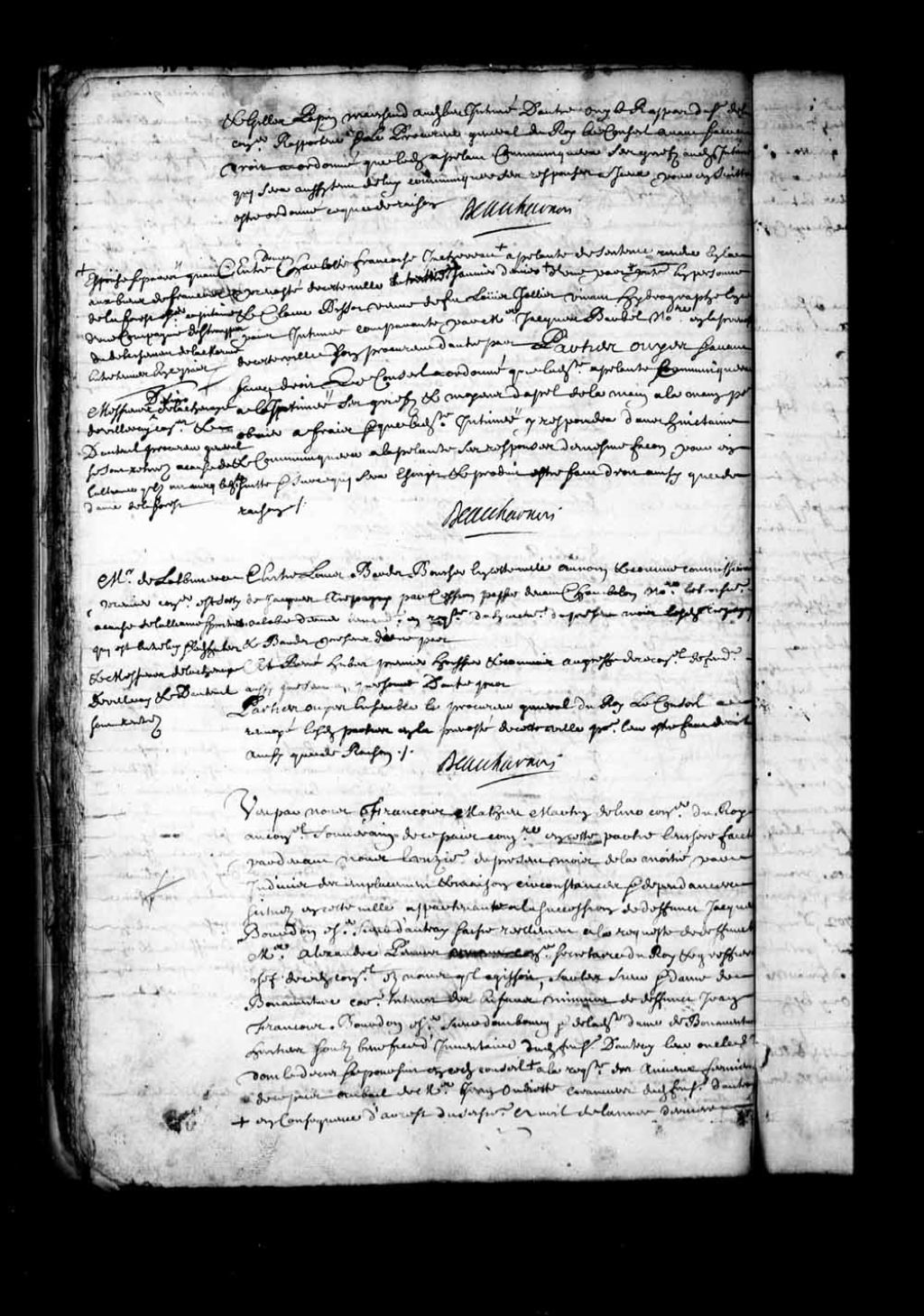 - Transcription du texte avec orthographe modernisée : «Vu par nous François Mathieu Martin Delino (De Lino) conseiller du Roi au Conseil souverain de ce pays commissaire en cette partie l'enchère faite par-devant nous le onzième du présent mois de la moitié par indivis des emplacement et maison circonstances et dépendances situés en cette ville appartenant à la succession de défunt Jacques Bourdon écuyer sieur d'autray saisie réellement à la requête de défunt maître Alexandre Peuvret vivant conseiller secrétaire du Roi et greffier en chef de ce dit Conseil aux noms qu'il agissait, sur les sieur et dame de Bonaventure comme tuteurs des enfants mineurs de défunt Jean François Bourdon écuyer sieur Dombourg et de ladite dame de Bonaventure héritiers sous bénéfice d'inventaire dudit feu sieur Dautray leur oncle et dont le décret se poursuit en ce dit conseil en conséquence d'arrêt du seizième avril de l'année dernière par maître Florent de [...]