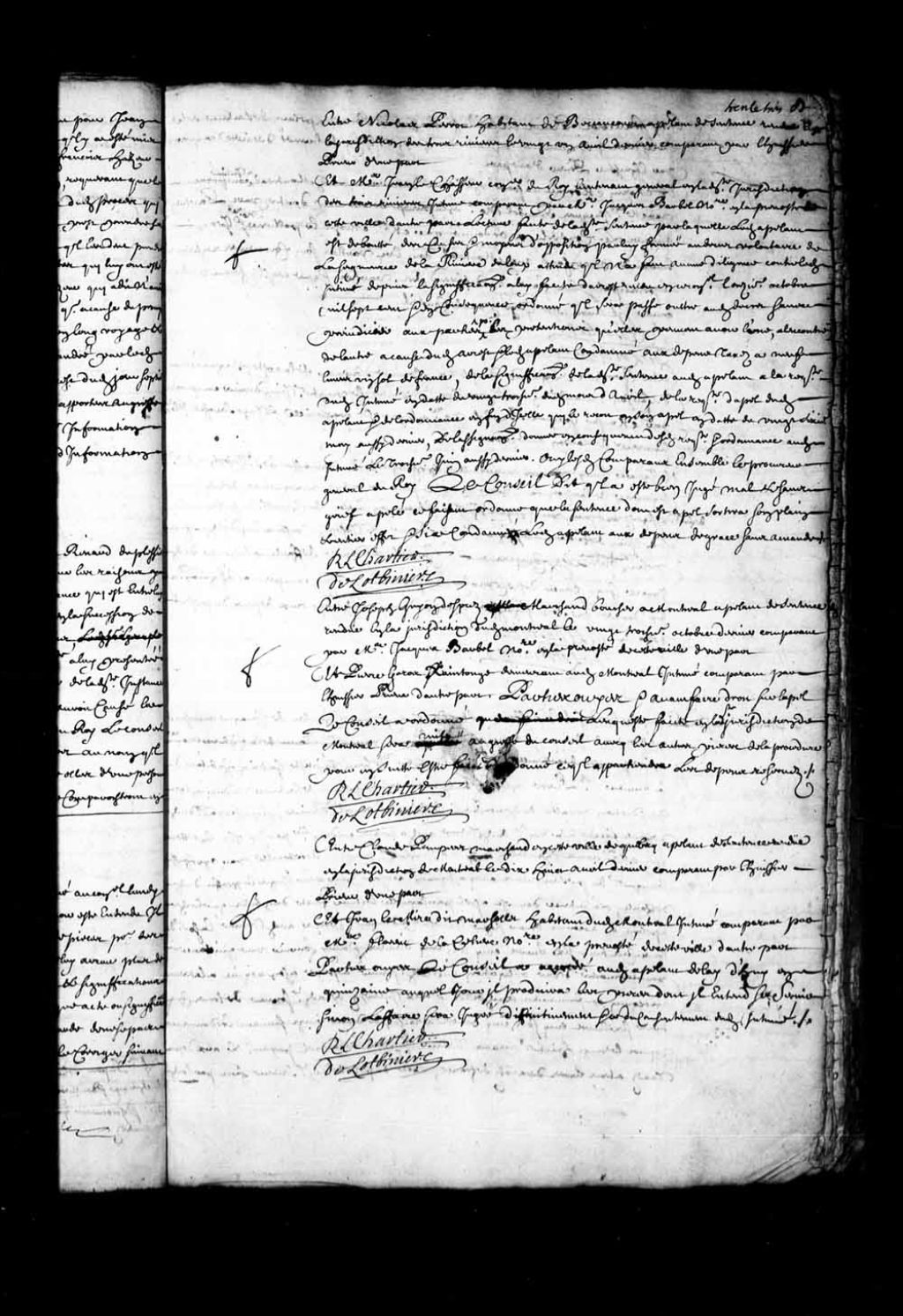 Transcription du texte avec orthographe modernisée : «Entre Claude PAUPERET marchand en cette ville de Québec appelant de sentence rendue en la juridiction de Montréal le dix-huit avril dernier comparant par l'huissier Prieur d'une part et Jean Lemire dit MARSOLLET (Marsolet) habitant dudit Montréal intimé comparant par maître Florent de Lacetière notaire en la prévôté de cette ville d'autre part. Parties ouïes, le Conseil a accordé audit appelant délai d'hui en quinzaine auquel jour il produira les pièces dont il entend se servir sinon l'affaire sera jugée définitivement et ce du consentement dudit intimé. R. L. CHARTIER DE LOTBINIERE»