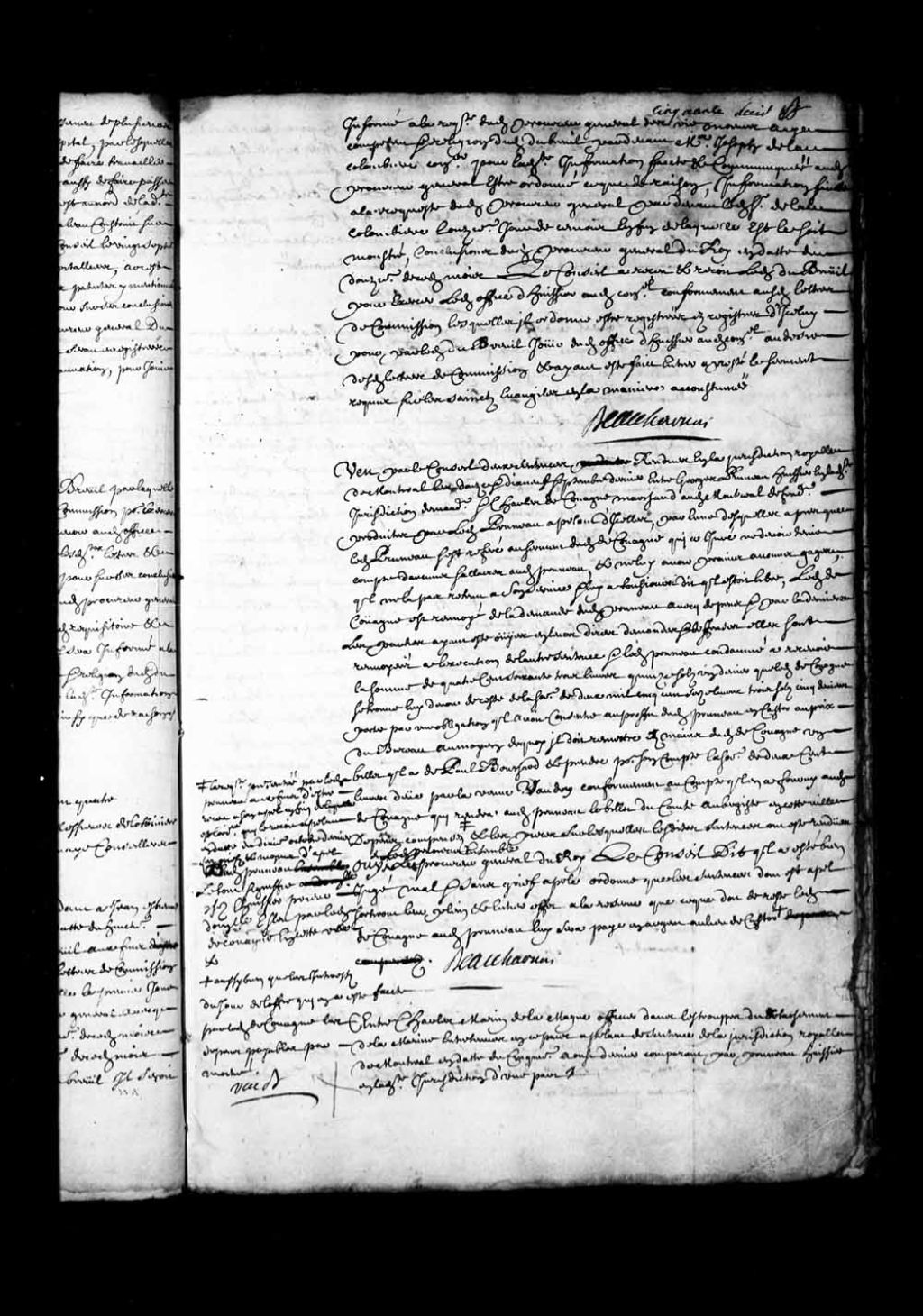 - Transcription du texte avec orthographe modernisée : «Entre Charles MARIN DE LAMAGUE (LaMargue) officier dans les troupes du détachement de la marine entretenues en ce pays appelant de sentence de la juridiction royale de Montréal en date du cinquième août dernier comparant par Pruneau huissier en ladite juridiction d'une part. Et Charles de LAUNAY (Delaunay) tanneur audit Montréal intimé comparant par Marandeau (Maranda) huissier en la prévôté de cette ville d'autre Part. Parties ouïes ensemble le procureur général du Roi et attendu les reproches fournies par ledit appelant contre les témoins ouïes à la requête de l'intimé, le Conseil a renvoyé les parties par-devant le juge dudit Montréal qu'il commet pour recevoir le serment dudit appelant et au cas qu'il fasse serment de ne rien devoir à l'intimé renverra les parties hors de Cour pour la laine demandée. BEAUHARNOIS.»