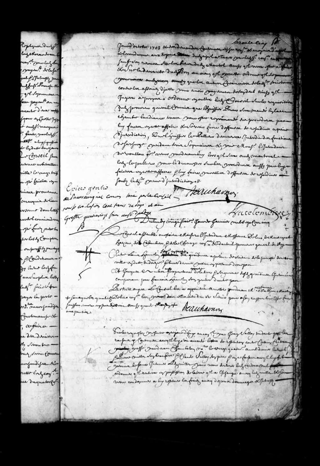 Transcription du texte avec orthographe modernisée : «Du lundi vingt-sixième jour de janvier mille sept cent-cinq. Le Conseil assemblé où étaient Monsieur l'intendant Messieurs Delino (De Lino) , de Monseignat Hazeur, de la Colombière (Lacolombière) , et de Lachenaie (Lachesnaye) conseillers et d'Auteuil procureur général du Roi. Entre Louis HAMELIN seigneur en partie des grondines appelant de sentence de la prévôté de cette ville en date du douzième février dernier présent en personne d'une part et Jacques Aubert aussi propriétaire en partie de la terre et seigneurie desdits grondines intimé comparant par François Hamelin son gendre d'autre part. Parties ouïes, le Conseil les a appointées à mettre par-devant maître François Mathieu Martin Delino (De Lino) conseiller les pièces dont elles entendent se servir pour à son rapport leur être fait droit ainsi que de raison sans que les qualités puissent nuire ni préjudicier aux parties. BEAUHARNOIS.»