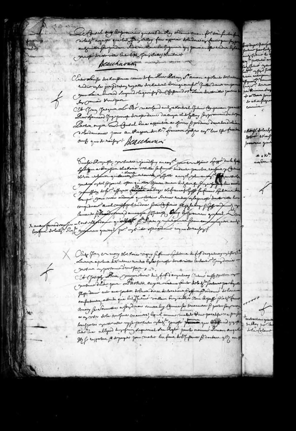 Transcription du texte avec orthographe modernisée : «Entre Jean AMORY (Amaury) et Marie VIGNY sa femme habitant du fief Dargentenay en l'île Saint-Laurent appelants de sentence rendue en la prévôté de cette ville le trentième juin dernier présents en personne d'une part. Et Joseph PERROT (Perrault) propriétaire du fief d'argentenay intimé aussi présent en personne d'autre part. Parties ouïes. Lecture faite de ladite sentence par laquelle il est donné acte aux parties de leurs dires déclarations et offres et ordonné de leur consentement, attendu que ledit intimé voulant bien oublier tout le passé et ladite femme amory se soumettre à son devoir envers lui comme sa tenancière et porter son mari a en user de la même manière, lequel comme malade d'une paralysie n'a pu se transporter en cette ville ni se présenter en ladite prévôté pourvu que le différent qui est entre eux à l'égard d'un chemin seigneurial soit réglé par le nommé Premont auquel Ils se rapportent et de payer par moitié les frais de l'instance et d'autant qu'ils ont été tous avancés par ledit intimé que le poulain appartenant auxdits appelants lui demeurera hypothéqué pour la moitié desdits frais et si le prix d'icelui ne suffisait de lui payer le surplus suivant l'estimation qui en sera faite, que lesdits frais seront payés par moitié aux conditions susdites et que ledit chemin sera réglé par ledit premont avec défenses auxdits appelants et à leur fils de méfaire ni médire audit intimé ou a autres personnes de sa famille sous telles peines qu'il appartiendra et lesdits appelants condamnés payer au commis greffier outre ladite moitié de frais convenue quarante-cinq sols pour ladite sentence, de l'acte d'appel interjeté de ladite sentence par ledit amory signifié audit intimé le quinzième de ce mois de la requête présentée audit Conseil par ledit intimé en anticipation de l'ordonnance enfin d'icelle qui le reçoit anticipant de l'exploit d'assignation donnée ledit jour quinzième de ce mois auxdits appelants par Quiniart sergent en ladite île ouï aussi le procureur général du Roi. Le Conseil dit qu'il a été bien jugé mal et sans grief appelé, ordonne que la sentence dont est appel sortira son plein et entier effet et condamne lesdits appelants aux dépens de l'appel à taxer par maître Charles de Monseignat conseiller à ce commis de grâce sans amende et leur donne acte de ce que ledit intimé ne demande que quatre journées de leur fils pour lui aider à faire ôter le Rocher qui est dans le chemin marqué par ledit Premont. BEAUHARNOIS.»
