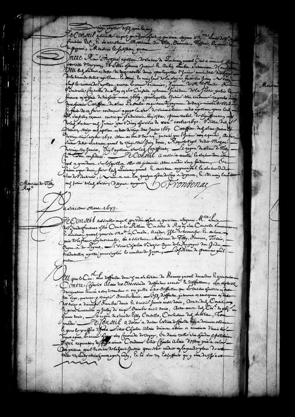 - Transcription du texte avec orthographe modernisée : «Du sixième mars 1673. Le Conseil assemblé auquel présidait haut et puissant seigneur messire Louis de Buade Frontenac chevalier comte de Palluau conseiller du Roi en ses Conseils gouverneur et lieutenant général pour sa Majesté en Canada, Acadie, île de Terre-Neuve et autres pays de la France septentrionale, où assistaient Messieurs de Tilly, Damours, Tesserie, Dupont et Depeiras, le sieur Charles Bazire agent de la compagnie des Indes Occidentales appelé pour suppléer le nombre de juges, le substitut du procureur général présent. Vu par le Conseil les défauts donnés au substitut du procureur général demandeur et accusateur contre Charles Alexis dit Desessards défendeur accusé et défaillant, les exploits d'assignations données à son de tambour et cri public audit défaillant par Levasseur huissier en date des sept, quatorze et vingtième décembre dernier, lesdits défauts intervenus en [...]