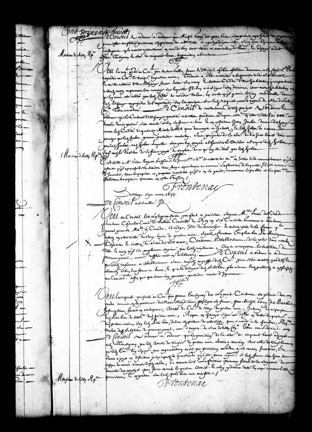 - Transcription du texte avec orthographe modernisée : «Du vingt-sept mars 1673. Le Conseil assemblé idem. Vu au Conseil les règlements faits par haut et puissant seigneur messire Louis de Buade Frontenac chevalier comte de Palluau conseiller du Roi en ses Conseils gouverneur et lieutenant général pour sa Majesté en Canada, Acadie, île de Terre-Neuve et autres pays de la France septentrionale, datés en cette ville du vingt-trois du présent mois signés Frontenac et plus bas par Monseigneur LeChasseur, et scellés du sceau de ses armes, contenant l'établissement de la police dans cette dite ville, et ainsi qu'il est amplement exprimé par lesdits règlements; ouï et ce requérant le substitut du procureur général, l'affaire mise en délibération Le Conseil a ordonné et ordonne que lesdits règlements et établissement seront registrés au greffe dudit Conseil pour être exécutés, gardés et observés selon leur forme et teneur, et qu'à la diligence [...]