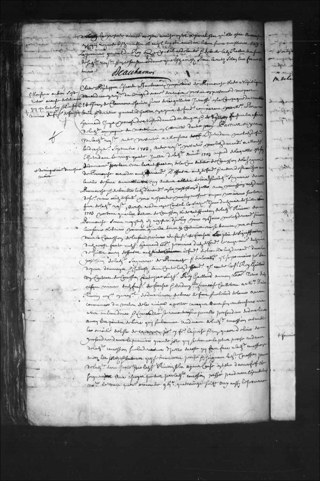 Transcription du texte avec orthographe modernisée : «Monsieur Aubert s'est retiré à cause de l'alliance qui est entre lui et l'enfant mineur du feu sieur de Fronsac. Entre Philippe ESNAULT BARBOCANT (Énaud dit Barbocant) propriétaire de Pocmouche et de Nepisiguit (Nipisiguit) demandeur en requête du vingt-deuxième de ce mois présent en personne d'une part. Et Jean de CLARMONT (Clermont) écuyer sieur de LaGALLIERE intéressé en la compagnie du mont Louis et directeur général d'icelle en ce pays défendeur comparant par maître Pierre Haimard (Émard) juge prévôt de Notre-Dame-des-Anges et de Syllery (Sillery) faisant les affaires de ladite compagnie du mont Louis en cette ville d'autre part. Parties ouïes vu ladite requête autre présentée à Monsieur l'intendant par ledit défendeur le dix-septième septembre 1703, autre requête présentée par ledit demandeur à Monsieur l'intendant le vingt-quatre juillet de ladite année 1703 au pied de laquelle est son ordonnance du vingt-sixième du même mois portant vu la ratification de la Cour du titre de concession de la seigneurie de Pocmouche accordée audit demandeur, défenses audit défendeur et autres de s'immiscer à l'avenir de faire aucunes traites ni aucuns abattis de bois sur ladite seigneurie de Pocmouche et de troubler ledit demandeur en la possession d'icelle avec permission audit demandeur, de faire venir ledit défendeur pour répondre par lui-même ou par procureur sur les fins de ladite requête, arrêt rendu en ce Conseil le seizième jour dudit mois de juillet 1703 portant que les lettres de concession et de ratification de ladite Rivière de Pocmouche seront registrés aux registres d'icelui pour en jouir par ledit demandeur suivant leur forme et teneur pourvu que les terres y contenues ne se trouvent pas enfermées dans la concession de l'enfant mineur du feu sieur de Fronsac exploit de signification dudit arrêt faite audit sieur Haimard (Émard) comme procureur dudit défendeur le vingt et unième dudit mois de juillet avec défenses audit sieur défendeur de troubler ledit demandeur dans la possession de ladite seigneurie de Pocmouche et déclaration qu'il se pourvoira pour ses dépens dommages et intérêts tant contre ledit défendeur que contre le sieur Rey Gaillard un contrat de concession faite par ledit sieur Rey Gaillard au nom et comme tuteur dudit enfant mineur dudit feu sieur de Fronsac et de demoiselle Françoise Cailleteau à maître Denis Riverin conseiller en ce Conseil de deux lieues de terre de front sur le bord de la mer à commencer du milieu de la rivière appelée Caraquet dans son embouchure vis-à-vis ou l'eau douce et l'eau salée se rencontrent sur pareille profondeur de deux lieues avec les pointes de terre qui se trouvent au-devant de ladite concession ensemble la moitié de l'île de Caraquet pour y faire la pêche et un quart de lieue de profondeur dans la première grande île qui se trouve la plus proche au-devant de ladite concession sur la devanture d'icelle du côte qui fait face à ladite concession avec les îlets et battures qui se trouveront proche et joignant ladite concession pour de ladite terre jouir par ledit Riverin et ses ayant cause en titre d'arrière fief et seigneurie aux charges portées par ladite concession passée par-devant Chambalon notaire le vingt-quatrième novembre mille six cent quatre-vingt seize ouï aussi le procureur général du Roi. Le Conseil a maintenu et maintient ledit demandeur en la jouissance et possession de ladite seigneurie de Pocmouche conformément à son arrêt dudit jour seizième juillet 1703, en ce faisant ordonne que ledit défendeur déguerpira incessamment de ladite seigneurie de Pocmouche, jusqu'à ce qu'il ait fait arpenter la seigneurie de l'enfant mineur dudit feu sieur de Fronsac pour savoir si elle est enfermée en icelle et l'a condamné aux dépens dommages et intérêts dudit demandeur à taxer par maître François Mathieu Martin Delino (De Lino) conseiller à ce commis, sauf le recours dudit défendeur à l'encontre de qui il avisera bon être. Monsieur Dellino BEAUHARNOIS.»