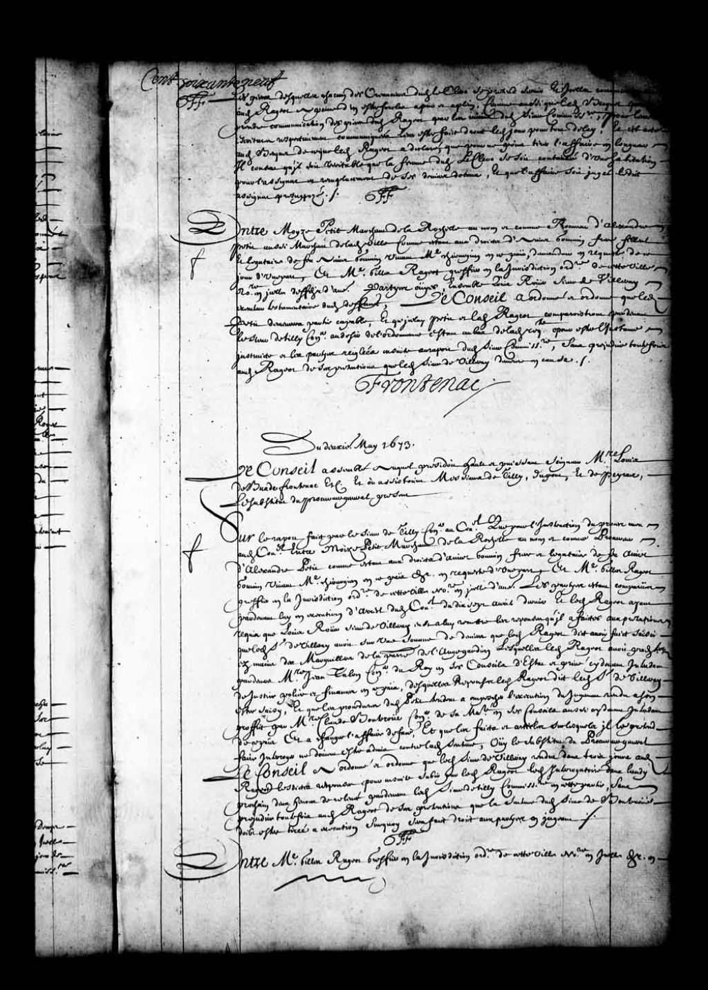 Transcription du texte avec orthographe modernisée : «Entre Moïse PETIT marchand de La Rochelle au nom et comme procureur de Alexandre Petit aussi marchand de ladite ville comme étant aux droits de Anicet Goumin frère filleul et légataire de feu Anicet Goumin vivant maître chirurgien en ce pays, demandeur en requête de ce jour d'une part, et maître Gilles RAGEOT greffier en la juridiction ordinaire de cette ville notaire en icelle défendeur d'autre. Parties ouïes ensemble Louis Rouer sieur de Villeray exécuteur testamentaire dudit défunt; le Conseil a ordonné et ordonne que ledit Petit demeurera partie capable, et qu'icelui Petit et ledit Rageot comparaîtront par-devant le sieur de Tilly conseiller au désir de l'ordonnance étant au bas de ladite requête pour être l'instance instruite et les parties réglées ensuite au rapport dudit sieur commissaire, sans préjudice toutefois audit Rageot de ses prétentions que ledit sieur de Villeray demeure en cause. FRONTENAC.»