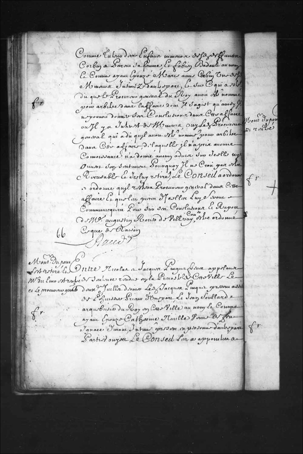 - Transcription du texte avec orthographe modernisée : «Monsieur Dupont s'est retiré et Monsieur Delino (De Lino) est rentré et le procureur général. Entre Nicolas et Jacques PINGUET frères appelant de sentence rendue en la prévôté de cette ville le deuxième juillet dernier ledit Jacques Pinguet présent assisté de l'huissier Prieur d'une part, et Jean SOULLARD (Soulard) arquebusier du Roi en cette ville au nom et comme ayant épousé Catherine Miville veuve de feu Ignace durant (Durand) , intimé présent en personne d'autre part. Parties ouïes, le Conseil les a appointées à mettre les pièces dont elles entendent se servir par-devant maître Mathieu François Martin Delino (De Lino) conseiller pour à son rapport leur être fait droit ainsi que de raison. RAUDOT.»