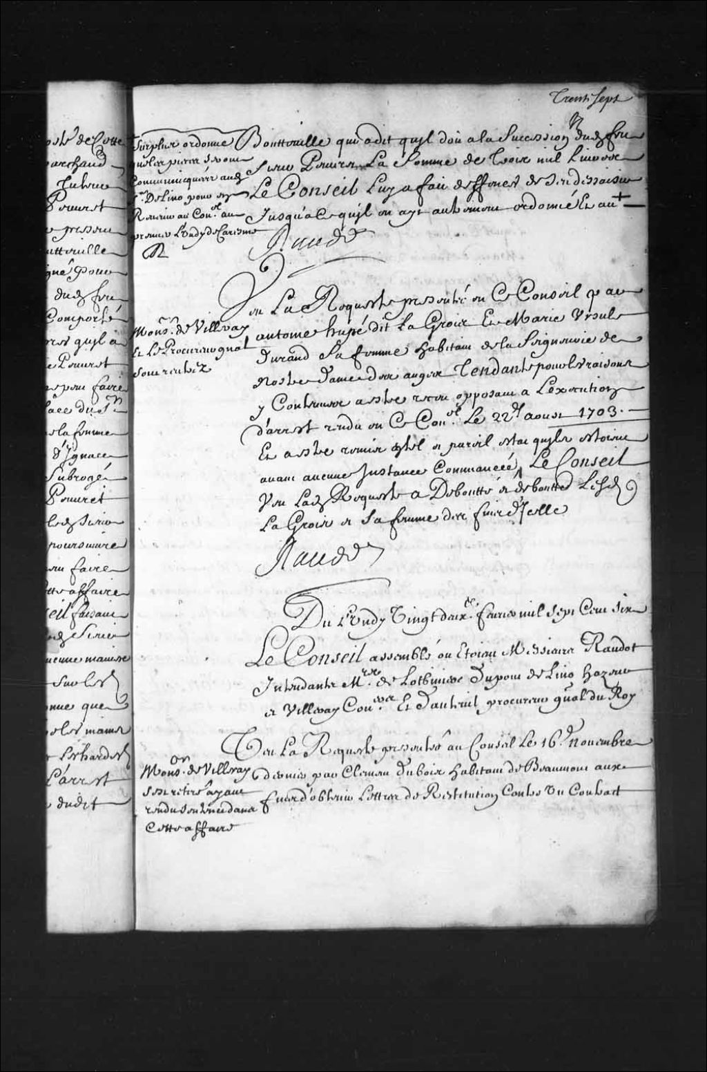 - Transcription du texte avec orthographe modernisée : «Du lundi vingt-deuxième février mille sept cent six. Le Conseil assemblé où étaient Messieurs Raudot intendants Messieurs de Lotbinière Dupont Delino (De Lino) Hazeur et Villeray conseillers et d'Auteuil procureur général du Roi. Monsieur de Villeray s'est retiré ayant rendu sentence dans cette affaire. Vu la requête présentée au Conseil le 16e novembre dernier par Clément Dubois habitants de Beaumont aux fins d'obtenir lettres de restitution contre un contrat de vente par lui consenti à François Dubois son frère attendu qu'il était en minorité lorsqu'il a fait ladite vente ledit contrat passé par-devant Chambalon notaire le 8e avril 1696 pour la somme de cent soixante livres lequel contrat le Conseil par son arrêt rendu le 30e mars de l'année dernière, entre Jean Salloy (Salois) et Clément Ruelle (Ruel) acquéreurs desdits François et Clément Dubois a ordonné que le contrat fait pendant la minorité dudit Clément Dubois audit François son frère subsisterait jusqu'à ce qu'il eût été annulé par les formes ordinaires, arrêt rendu enfin de ladite requête ledit jour seize novembre dernier portant qu'elle serait communiquée avec les pièces y attachées au procureur général du Roi pour ensuite être ordonné ce que de raison, copie dudit arrêt dudit jour 30e mars dernier signifié audit Clément Ruelle à la requête dudit Salloy par Oger huissier le sixième jour de mai aussi dernier, extrait baptistaire dudit Clément Dubois signé Lamy curé de la paroisse de la Sainte-Famille par lequel il paraît que ledit Clément Dubois est né le vingt-cinquième novembre mille six cent soixante et onze, contrat de vente fait par ledit Clément Dubois audit François Dubois son frère ledit jour huitième avril 1696. Conclusions du procureur général du Roi du 20e de ce mois, le Conseil a accordé et accorde audit Clément Dubois lettres de restitution contre ledit contrat de vente par lui fait à sondit frère ledit jour huit avril mille six cent quatre-vingt-seize lesquelles lui seront expédiées par le greffier en chef de ce Conseil pour être entérinées par le Conseil si faire se doit. RAUDOT.»