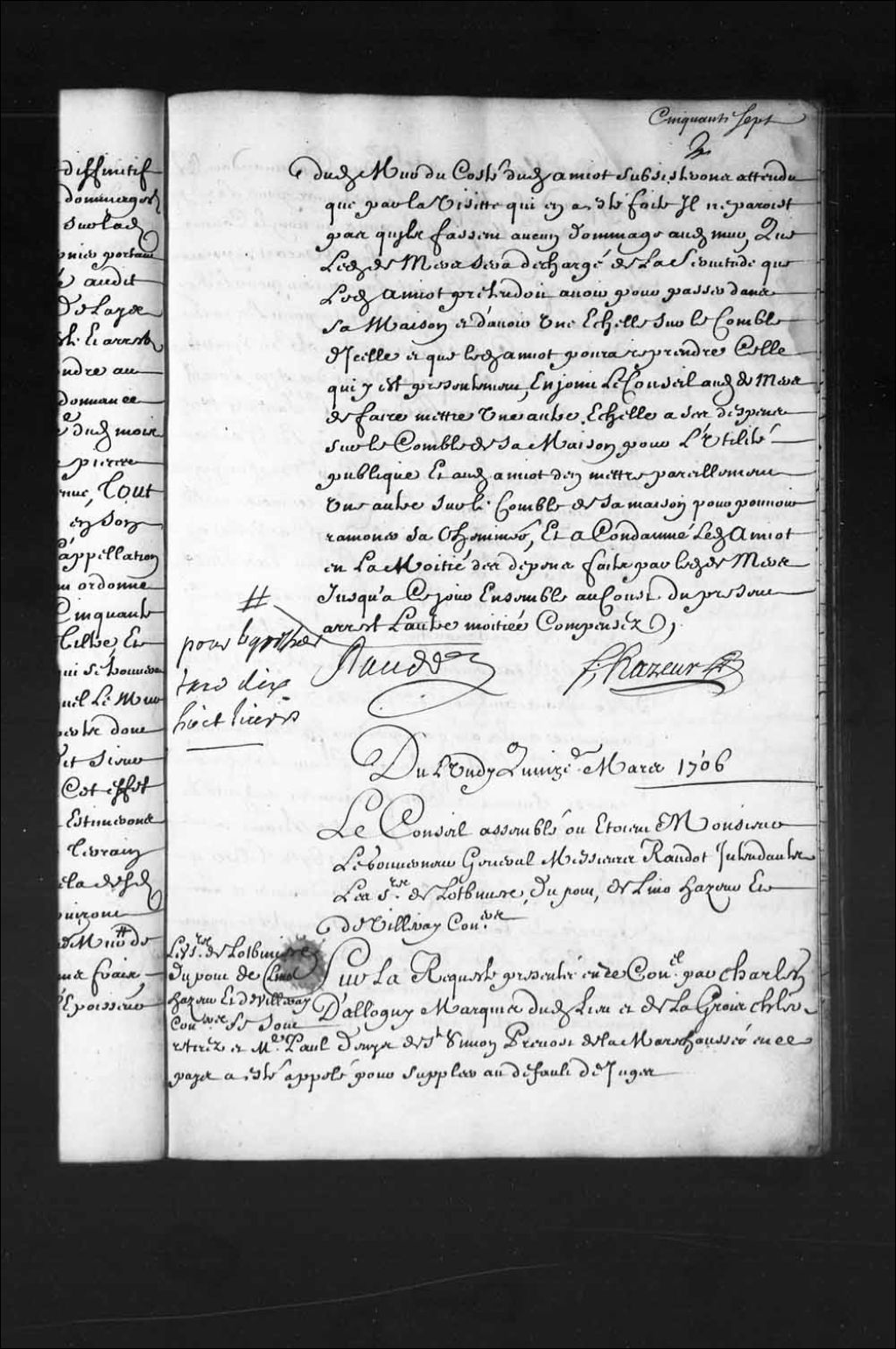 - Transcription du texte avec orthographe modernisée : «Du lundi quinze mars 1706. Le Conseil assemblé où étaient Monsieur le gouverneur général Messieurs Raudot intendants les sieurs de Lotbinière Dupont, Delino (De Lino) Hazeur et de Villeray conseillers Les sieurs de Lotbinière Dupont Delino (De Lino) Hazeur et de Villeray conseillers se sont retirés et maître Paul Denys de Saint-Simon prévôt de la maréchaussée en ce pays a été appelé pour suppléer à défaut de juges. Sur la requête présentée en ce Conseil par Charles d'Allogny (Aloigny) marquis dudit lieu et de Lagrois (Lagroix) chevalier de l'ordre militaire de Saint-Louis commandant les troupes de la marine entretenues pour le service de sa Majesté en ce pays au nom et comme ayant épousé dame Geneviève Macart (Macard) auparavant veuve de François Prévost gouverneur pour le Roi aux Trois-Rivières, tendante pour les causes y contenues à ce que l'acte de société du vingt-trois octobre [...]