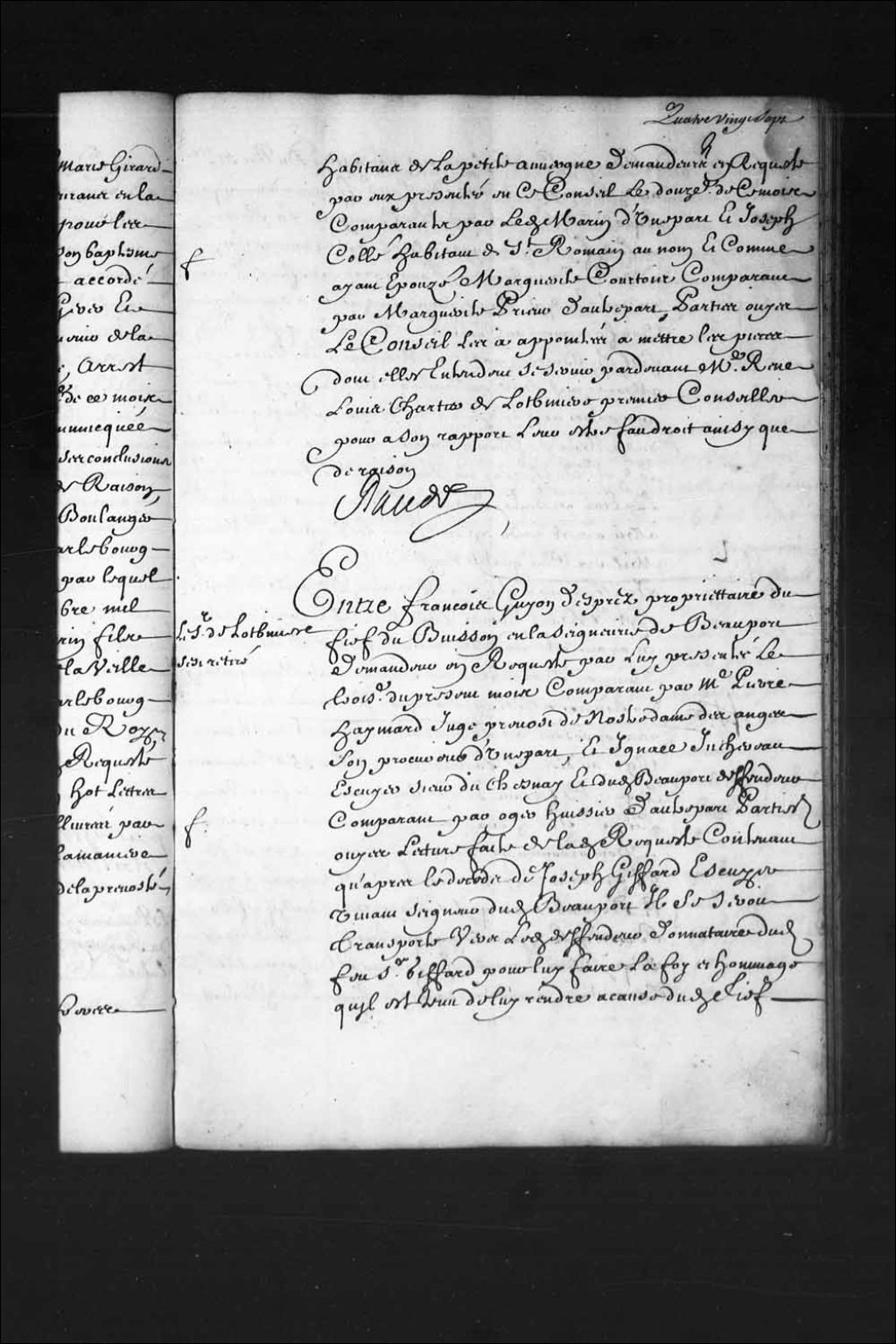 - Transcription du texte avec orthographe modernisée : «Le sieur de Lotbinière s'est retiré. Entre François GUYON DESPREZ (Després) propriétaire du fief Dubuisson en la seigneurie de Beauport demandeur en requête par lui présentée le troisième du présent mois comparant par maître Pierre Haymard (Haimard, Émard) juge prévôt de Notre-Dame-des-Anges son procureur d'une part, et Ignace JUCHEREAU écuyer sieur Duchesnay et dudit Beauport défendeur comparant par Oger huissier d'autre part. Parties ouïes. Lecture faite de ladite requête contenant qu'après le décès de Joseph Giffard écuyer vivant seigneur dudit Beauport il se serait transporté Vers ledit défendeur donataire dudit feu sieur Giffard pour lui faire la foi et hommage qu'il est tenu de lui rendre à cause dudit fief Dubuisson comme il paraît par acte de Duprac notaire audit Beauport en date du troisième février dernier, par lequel ledit sieur Duchesnay de Beauport la reçu en ladite foi [...]