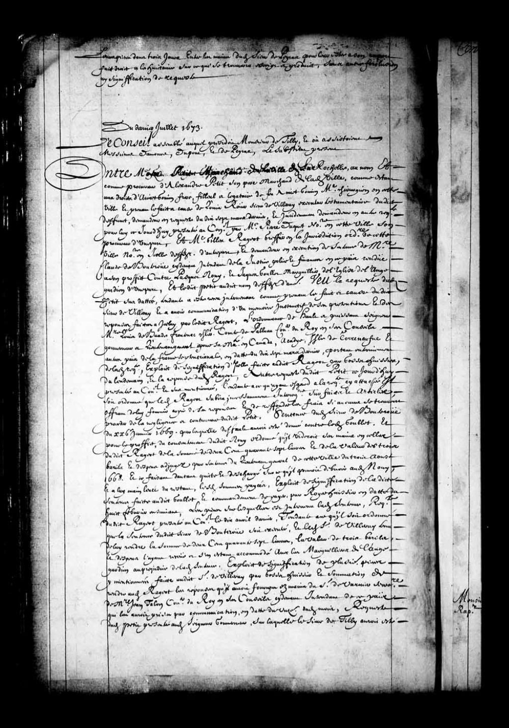 - Transcription du texte avec orthographe modernisée : «Du dernier juillet 1673. Le Conseil assemblé auquel présidait Monsieur de Tilly, et où assistaient Messieurs Damours, Dupont, et Depeiras, le substitut présent. Entre Moïse PETIT marchand de la ville de La Rochelle, au nom et comme procureur de Alexandre Petit son père marchand de ladite ville, comme étant aux droits de Anicet Gomin frère filleul et légataire de feu Anicet Gomin, maître chirurgien en cette ville et prenant le fait et cause de Louis Rouer sieur de Villeray, exécuteur testamentaire dudit défunt, demandeur en requête du dix-sept mars dernier, et incidemment demandeur en autre requête pour lui ce jourd'hui présentée au Conseil par maître Pierre Duquet notaire en cette ville son procureur d'une part; et maître Gilles Rageot, greffier en la juridiction ordinaire de cette ville, notaire en icelle défendeur, d'autre part, et demandeur en exécution de sentence de messire Claude de Bouteroue ci-devant intendant de la justice police et finances en ce pays, rendue à son profit contre Pasquet Nouy, et Jacques Goullet marguillier de l'église de l'Ange-Gardien d'une part, et ledit PETIT audit nom défendeur d'autre. Vu la requête dudit Petit sus-datée, tendante à être reçu intervenant comme prenant le fait et cause dudit sieur de Villeray, et à avoir communication d'un mémoire instructif de ses prétentions et des réponses faites à icelui par ledit Rageot; l'ordonnance de haut et puissant seigneur messire Louis de Buade Frontenac chevalier comte de Palluau conseiller du Roi en ses Conseils, gouverneur et lieutenant général pour sa Majesté en Canada, Acadie, île de Terre-Neuve et autres pays de la France septentrionale, en date du dix-sept mars dernier, portant entérinement de ladite requête; exploit de signification d'icelle faite audit Rageot par Gosset huissier, du lendemain, et la réponse dudit Rageot; autre requête dudit Petit ce jourd'hui présentée au Conseil et sus-mentionnée, tendante à ce qu'ayant égard à la requête ci-attachée, il soit ordonné que ledit Rageot subira incessamment interrogatoire sur faits et articles, offrant de lui fournir copie de ses réponses et de refonder les frais si aucuns se trouvent procéder de la négligence et contumace dudit Petit sentence dudit sieur de Bouteroue du vingt-cinquième janvier 1669 par laquelle défaut aurait été donné contre ledit Goullet et pour le profit, du consentement dudit Nouy, ordonné qu'il viderait ses mains en celles dudit Rageot de la somme de deux cent quarante-sept livres et de la valeur de trois barils et dépens adjugés par sentence du lieutenant général de cette ville du trois août 1668 et ce faisant, d'autant quitte et déchargé sur ce qu'il pourrait devoir audit Nouy, et à lui mainlevée du restant, lesdites sommes payées; exploit de signification de ladite sentence faite audit Goullet et commandement de payer par Roger huissier en date du huit février ensuivant; les pièces sur lesquelles est intervenu ladite sentence; requête dudit Rageot présentée au Conseil le dix avril dernier, tendante à ce qu'il soit ordonné que la sentence dudit sieur de Bouteroue soit exécutée, et ledit sieur de Villeray tenu à lui rendre la somme de deux cent quarante-sept livres, la valeur de trois barils et dépens, l'ayant reçue et s'en étant accommodé avec les marguilliers de l'Ange-Gardien au préjudice de ladite sentence; exploit de signification de plusieurs pièces y mentionnées, faite audit sieur de Villeray par Gosset huissier et sommation de rendre audit Rageot les réponses qu'il aurait fournies en les mains du sieur de Varnier secrétaire de messire Jean Talon conseiller du Roi en ses Conseils ci-devant intendant de ce pays, qui les aurait prises par communication, en date du onzième dudit mois; requête dudit Petit présentée audit seigneur gouverneur, sur laquelle le sieur de Tilly aurait été pour interroger ledit Rageot sur faits et articles, par son ordonnance du dix-septième avril dernier; signification d'icelle audit Rageot par Gosset huissier, dudit jour; arrêt du Conseil dudit jour dix-septième avril dernier portant que ledit Petit demeurerait partie capable, et que les parties comparaîtraient par-devant ledit sieur de Tilly conseiller au désir de l'ordonnance dudit seigneur gouverneur pour l'instruction de l'instance et être les parties réglées à son rapport, sans préjudice audit Rageot de ses prétentions, que ledit sieur de Villeray demeurerait en cause; procès-verbal dudit sieur commissaire dudit jour contenant les dires desdites parties et ordonnance que ledit Petit donnerait communication audit Rageot des faits et articles y mentionnés pour en venir au lendemain huitaine deux heures de relevée, et au surplus qu'il en serait par lui référé au Conseil; autre arrêt du deux mai dernier rendu en conséquence dudit procès-verbal sur le rapport dudit sieur commissaire portant que ledit sieur de Villeray rendrait dans trois jours audit Rageot lesdites réponses, pour ensuite subir par lui l'interrogatoire par-devant ledit sieur commissaire dans le lundi d'après, sans préjudice toutefois audit Rageot de ses prétentions que la sentence dudit sieur de Bouteroue doit être exécutée. Sur quoi serait fait droit aux parties en jugeant; copie dudit arrêt par signification et la réponse dudit sieur de Villeray produite par ledit Petit; exploit de signification dudit arrêt faite audit sieur de Villeray par ledit Gosset le cinquième dudit mois contenant sa réponse que l'affaire ne le regarde plus, ledit Petit ayant pris son fait et cause, qu'il n'était plus saisi d'aucunes pièces, les ayant remises audit Petit à qui ledit Rageot se devait adresser; autre procès-verbal dudit sieur commissaire du huit dudit mois contenant les dires et déclarations dudit Rageot, l'offre de subir l'interrogatoire sa demande que lesdits sieurs de Villeray et Petit soient condamnés en se