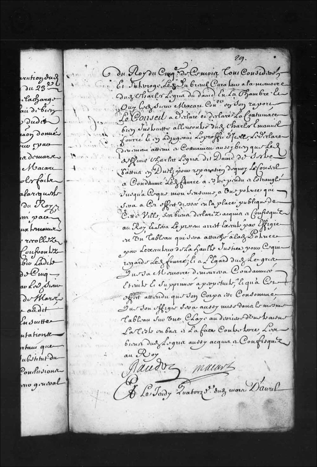 Prononcé et exécution de l'arrêt du 11 avril 1707 concernant la sentence de mort à l'encontre de Charles-Emmanuel Fourré dit Lavocat, soldat dans les troupes du détachement de la Marine, et du nommé Dubreuil, comme curateur du cadavre de Charles Legris dit David, sergent des dites troupes du détachement de la Marine, 14 avril 1707, Archives nationales à Québec, Fonds Conseil souverain, (03Q,TP1,S28,P8485).