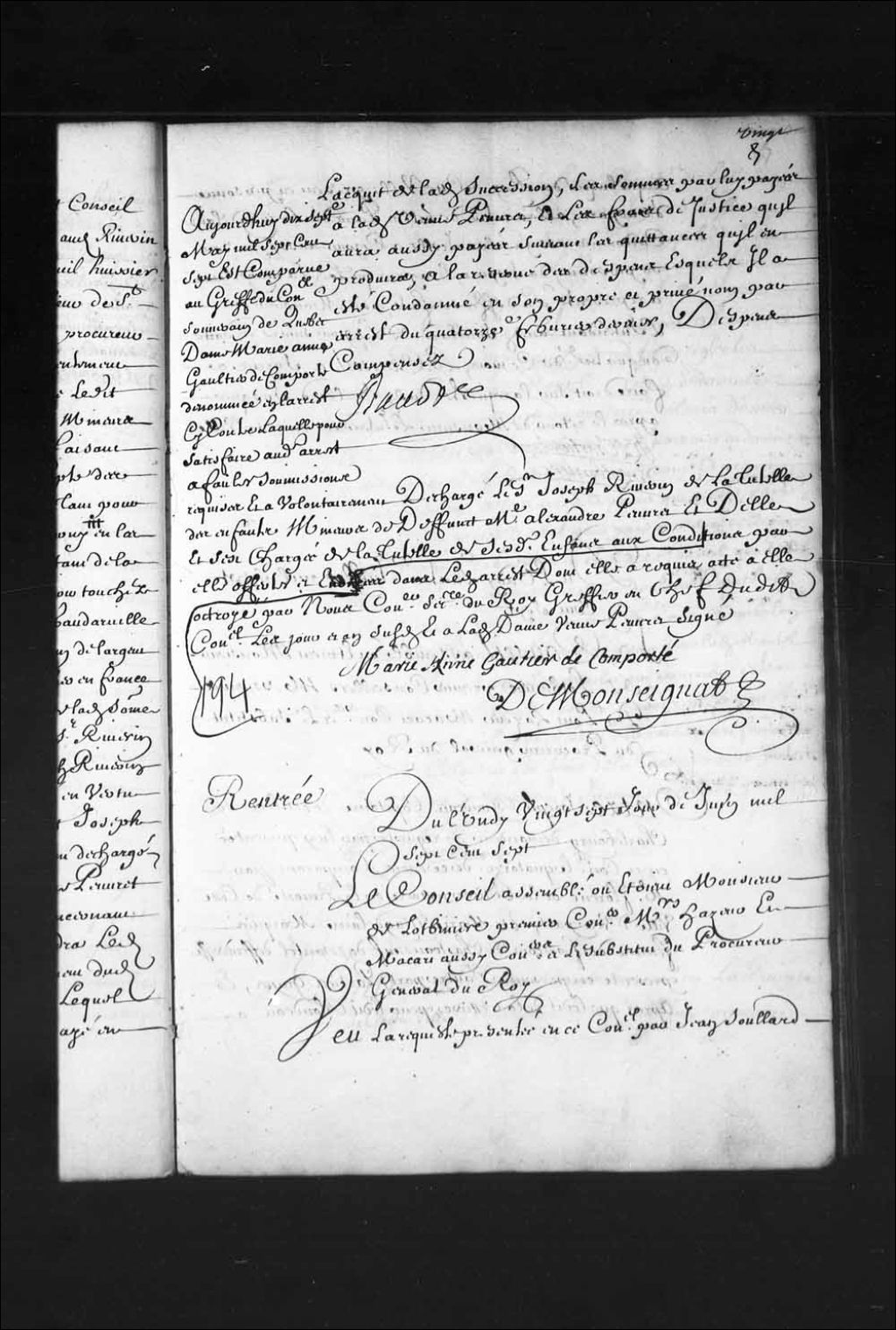 - Transcription du texte avec orthographe modernisée : «Du lundi vingt-sept jour de juin mille sept cent sept. Le Conseil assemblé où étaient Monsieur de Lotbinière premier conseiller Messieurs Hazeur et Macart (Macard) aussi conseillers et le substitut du procureur général du Roi. Vu la requête présentée en ce Conseil par Jean Soullard (Soulard) arquebusier du Roi en cette ville présent en personne d'une part, à l'encontre de Gilles Paris dit LaMadeleine cordonnier assigné sur icelle à ce jour aussi présent en personne d'autre part, et après que ledit LaMadeleine a représenté la défense faite par Monsieur l'intendant audit Soullard de le poursuivre en date du quatrième de ce mois, le Conseil a sursis à faire droit sur la requête dudit Soullard jusque après le retour de Monsieur l'intendant en cette ville. R. L. CHARTIER DE LOTBINIERE.»