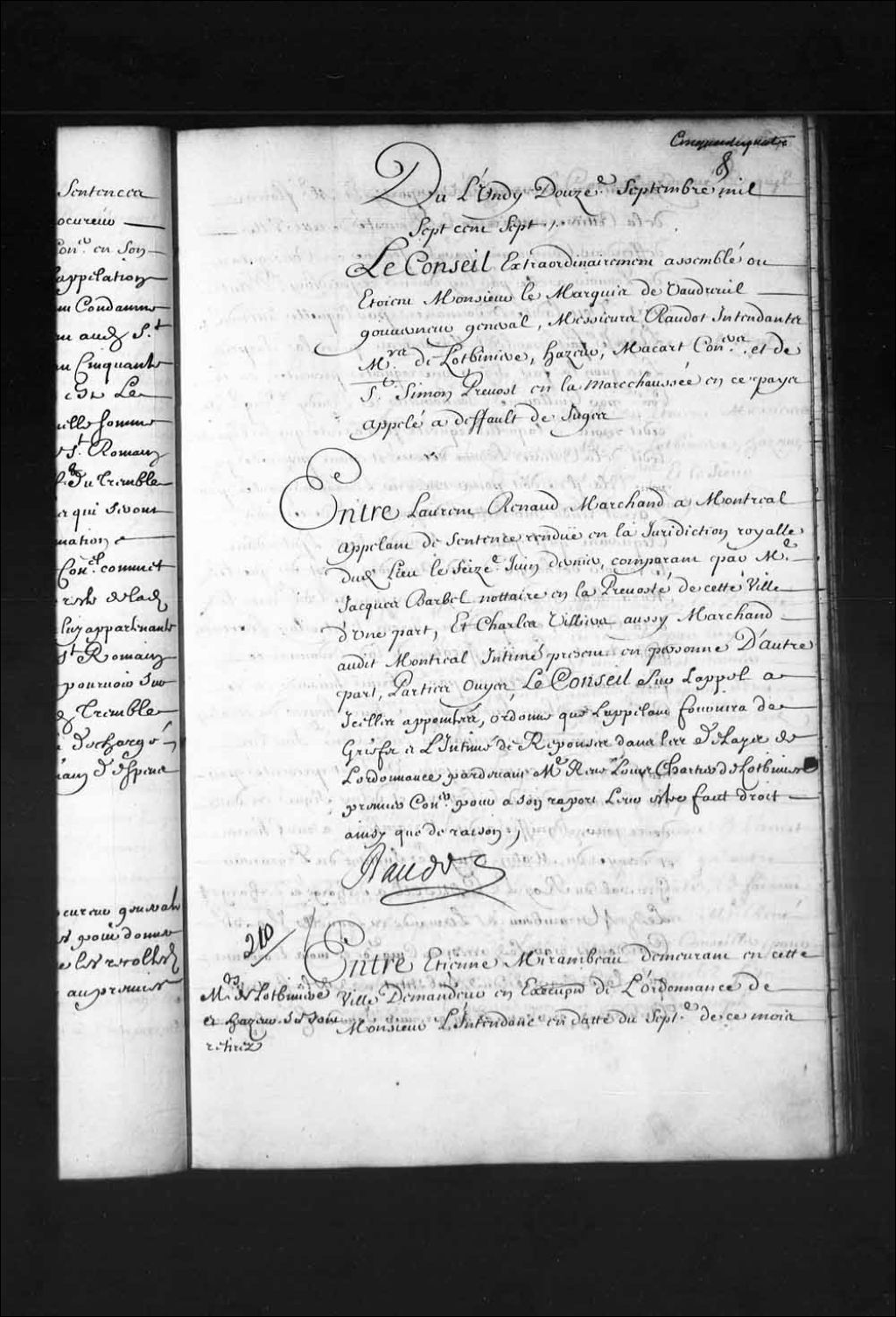 - Transcription du texte avec orthographe modernisée : «Messieurs de Lotbinière et Hazeur se sont retirés. Entre Etienne MIRAMBEAU demeurant en cette ville demandeur en exécution de l'ordonnance de Monsieur l'intendant en date du septième de ce mois présent en personne d'une part; et maître Florent de LACETTIERE (Lacetière) notaire en la prévôté de cette ville défendeur comparant par sa femme en conséquence du pouvoir à elle par lui donné ce jourd'hui d'autre part, vu ladite ordonnance par laquelle attendu l'exposé fait par ledit Mirambeau qu'on la surpris lors qu'on la fait signer une requête présentée en ce Conseil par Guillaume Bonhomme le lundi cinquième de ce dit mois de laquelle requête il n'a été que le Copiste ledit de LaCettière (Lacetière) l'ayant dressée et étant persuadé que pour cela il ne doit point encourir l'amende portée par l'arrêt rendu sur icelle ledit jour cinquième de ce mois, requérant qu'il plût à mondit sieur l [...]