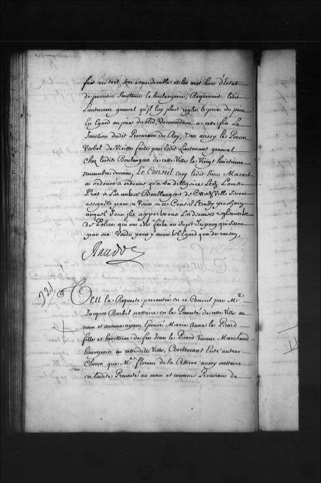 - Transcription du texte avec orthographe modernisée : «Vu la requête présentée en ce Conseil par maître Jacques Barbel notaire en la prévôté de cette ville au nom et comme ayant épousé Marie Anne le Picard fille et héritière de feu Jean le Picard (Lepicard) vivant marchand bourgeois en cette dite ville, contenant entre autres choses que maître Florent de LaCettière (Lacetière) aussi notaire en ladite prévôté au nom et comme procureur de Vital Caron bourgeois en cette dite ville faisant tant pour lui que pour Claude Caron bourgeois de Montréal héritiers de défunt Vital Oriol fils, ayant connaissance que ledit Barbel a pièces en main pour se disculper des demandes à lui faites par ledit Vital Caron desdits noms s'est avisé par un mauvais esprit de présenter requête au lieutenant général de ladite prévôté le sixième novembre dernier par laquelle il expose que ledit Barbel n'a voulu répondre que pour lui et demande qu'il lui soit permis de [...]