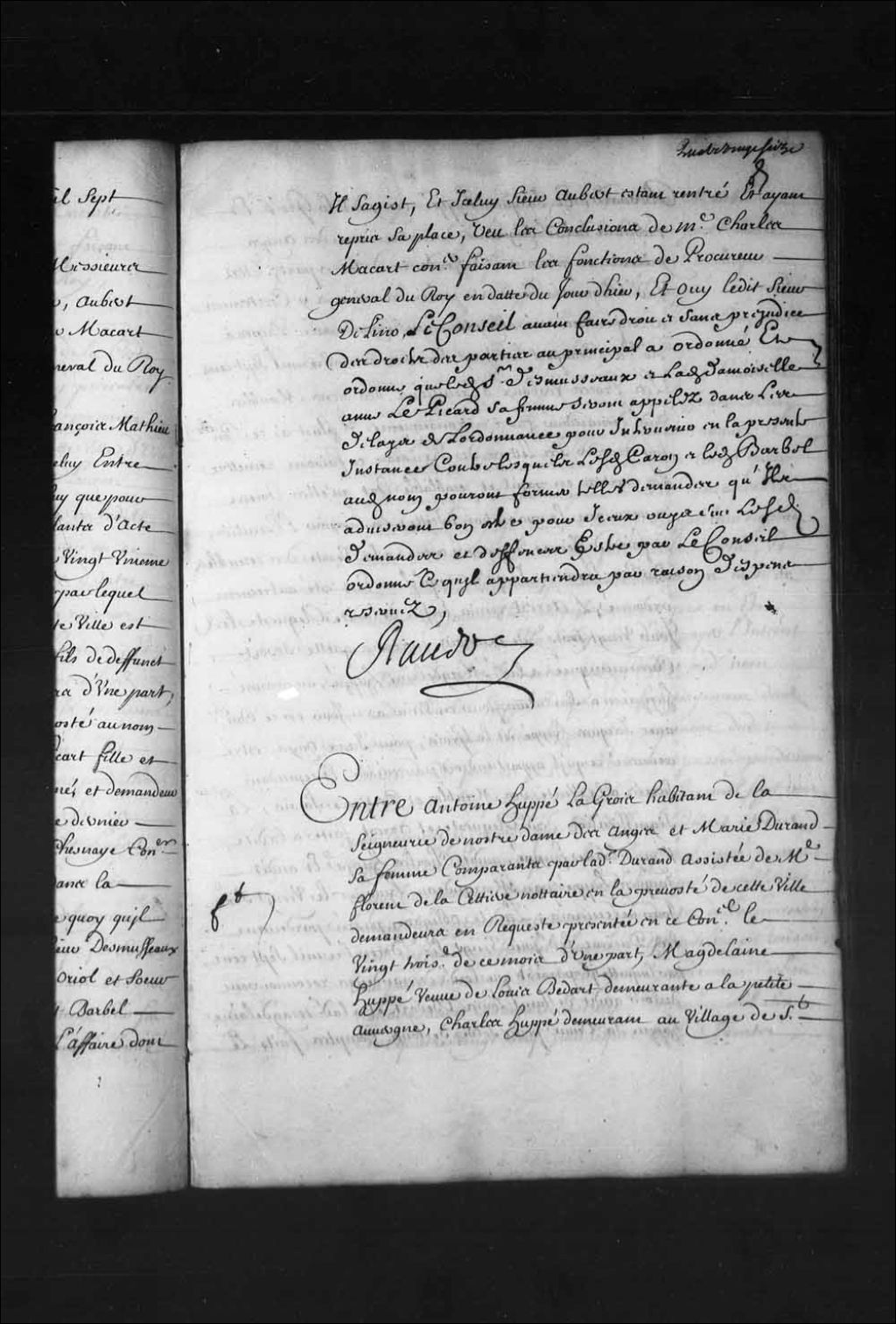 - Transcription du texte avec orthographe modernisée : «Entre Antoine HUPPÉ Lagrois (Lagroix) habitants de la seigneurie de Notre-Dame-des-Anges et Marie DURAND sa femme comparants par ladite Durand assistée de maître Florent de LaCettière (Lacetière) notaire en la prévôté de cette ville demandeurs en requête présentée en ce Conseil le vingt-troisième de ce mois d'une part, Madeleine HUPPÉ veuve de Louis Bedart (Bédard) demeurante à la petite Auvergne, Charles HUPPÉ demeurant au village de Saint-Bernard, et Jacques HUPPÉ aussi dit Lagrois (Lagroix) et habitant de ladite seigneurie de Notre-Dame-des-Anges présents en personne défendeurs d'autre part, vu ladite requête tendante pour les raisons y contenues à ce que vu une obligation passée par-devant Duprac notaire à Beauport le vingt-sixième décembre mille sept cent, les procès-verbaux d'exécutions des biens meubles dudit demandeur faits en conséquence il plut à ce Conseil lui accorder ses [...]