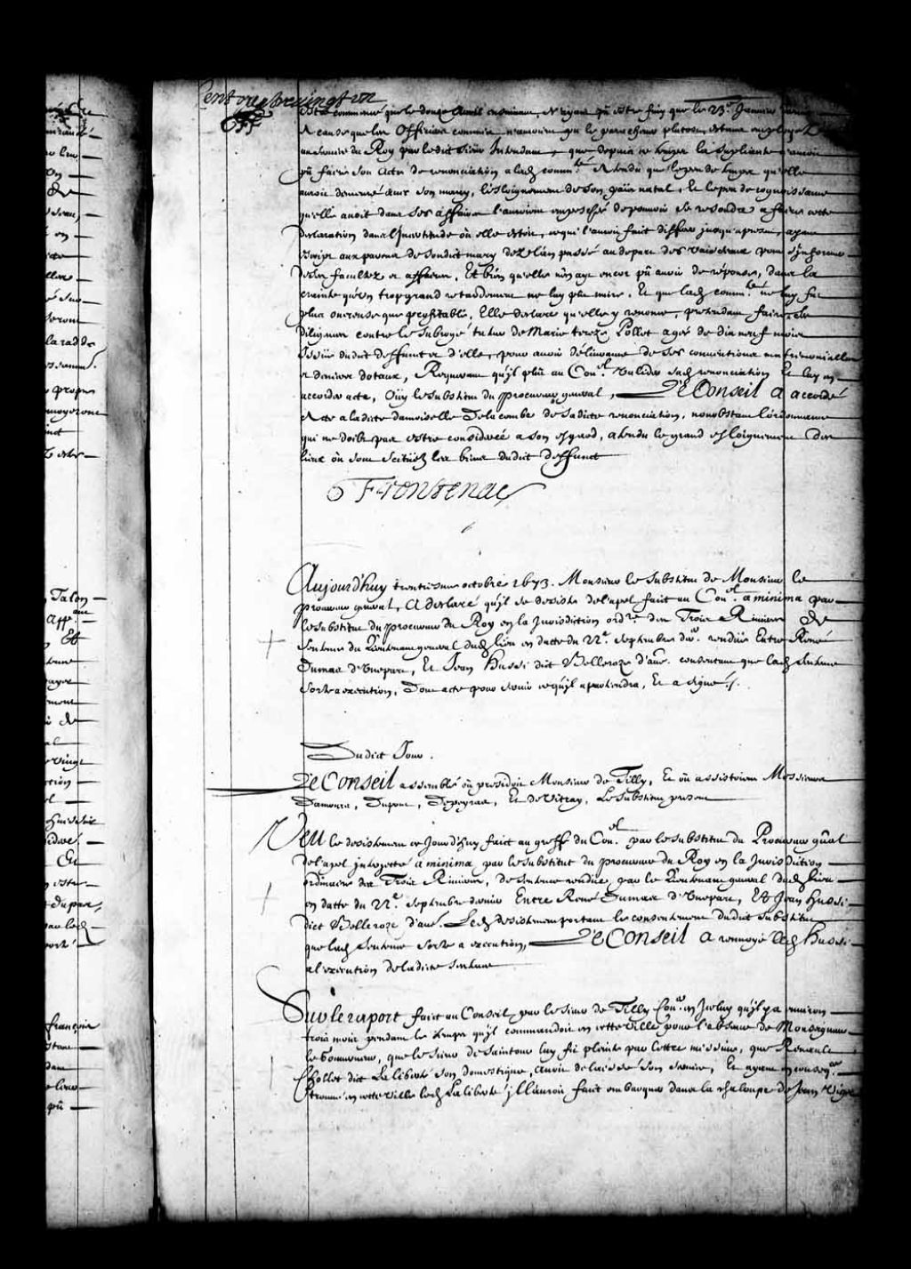 - Transcription du texte avec orthographe modernisée : «Sur le rapport fait au Conseil par le sieur de Tilly conseiller en icelui qu'il y a environ trois mois pendant le temps qu'il commandait en cette ville pour l'absence de Monseigneur le gouverneur, que le sieur de Saintour lui fit plainte par lettre missive, que Renaud Chollet dit Laliberté son domestique, avait délaissé son service, et ayant en conséquence trouvé en cette ville ledit Laliberté il l'aurait fait embarquer dans la chaloupe de Jean Viger pour le remettre en les mains dudit sieur de Saintour, et ledit Laliberté s'étant évadé de ladite chaloupe il le rencontra derechef le jourd'hier en cette ville et le fit constituer prisonnier, et qu'il est de l'ordre de voir ce qu'il est à propos de faire en cette affaire; ouï ledit Laliberté pour ce mandé à la chambre, qui a dit qu'il est vrai qu'il a délaissé le service dudit sieur de Saintour son maître, depuis sept ou huit jours [...]