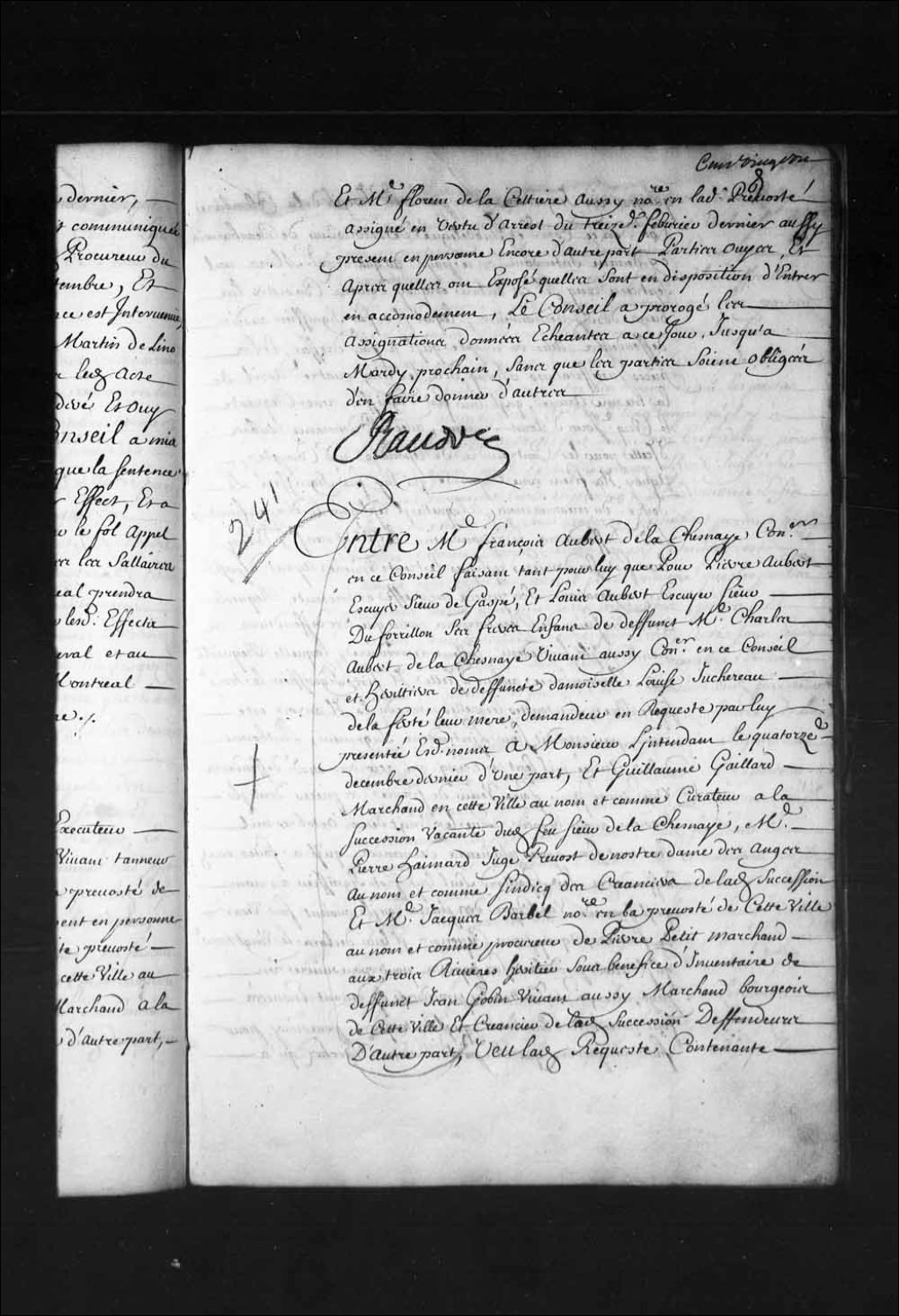 Transcription du texte avec orthographe modernisée : «Entre maître François Aubert de LACHESNAIE conseiller en ce Conseil faisant tant pour lui que pour Pierre Aubert écuyer sieur de Gaspé, et Louis Aubert écuyer sieur du Forillon ses frères enfants de défunt maître Charles Aubert de Lachesnaie vivant aussi conseiller en ce Conseil et héritiers de défunte demoiselle Louise Juchereau de Laferté leur mère, demandeur en requête par lui présentée auxdits noms à Monsieur l'intendant le quatorzième décembre dernier d'une part, et Guillaume GAILLARD marchand en cette ville au nom et comme curateur à la succession vacante dudit feu sieur de Lachesnaye, maître Pierre HAIMARD (Émard) juge prévôt de Notre-Dame-des-Anges au nom et comme syndic des créanciers de ladite succession et maître Jacques BARBEL notaire en la prévôté de cette ville au nom et comme procureur de Pierre Petit marchand aux Trois-Rivières héritier sous bénéfice d'inventaire de [...]