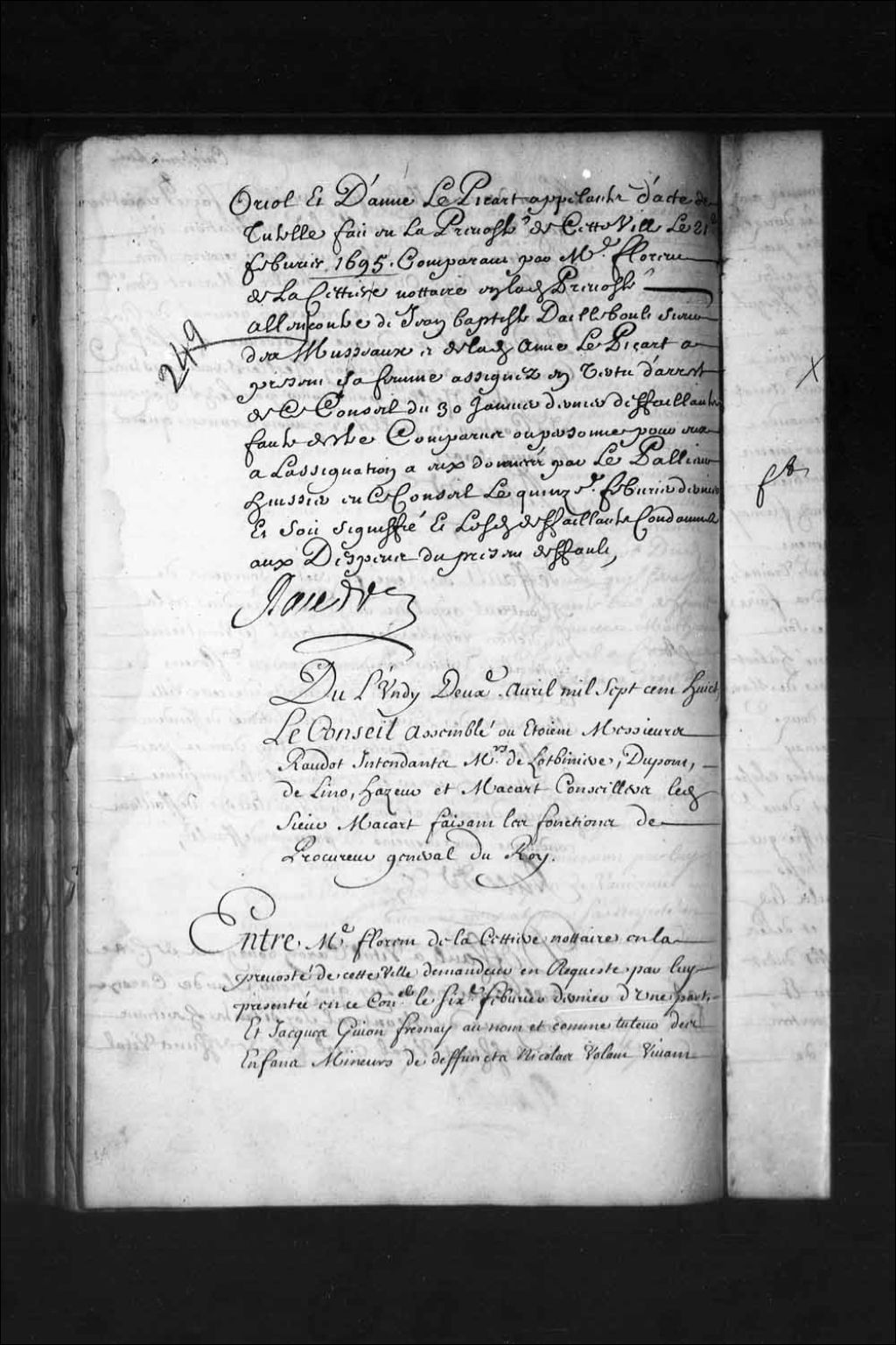 - Transcription du texte avec orthographe modernisée : «Du lundi deuxième avril mille sept cent huit. Le Conseil assemblé où étaient Messieurs Raudot intendants Messieurs de Lotbinière, Dupont, Delino (De Lino), Hazeur et Macart (Macard) conseillers ledit sieur Macart (Macard) faisant les fonctions de procureur général du Roi. Entre maître Florent de LACETTIERE (Lacetière) notaire en la prévôté de cette ville demandeur en requête par lui présentée en ce Conseil le sixième février dernier d'une part, et Jacques GUYON FRESNAY (Dufresnay) au nom et comme tuteur des enfants mineurs de défunts Nicolas Volant vivant marchand en cette ville et Geneviève Niel sa femme défendeur d'autre part, vu ladite requête tendante à ce qu'il plût à ce Conseil décharger ledit de LaCettière (Lacetière) de l'action à lui faite pour les dépens portés par arrêt du vingtième avril de l'année dernière sans préjudice aux parties des autres affaires qu'ils ont [...]