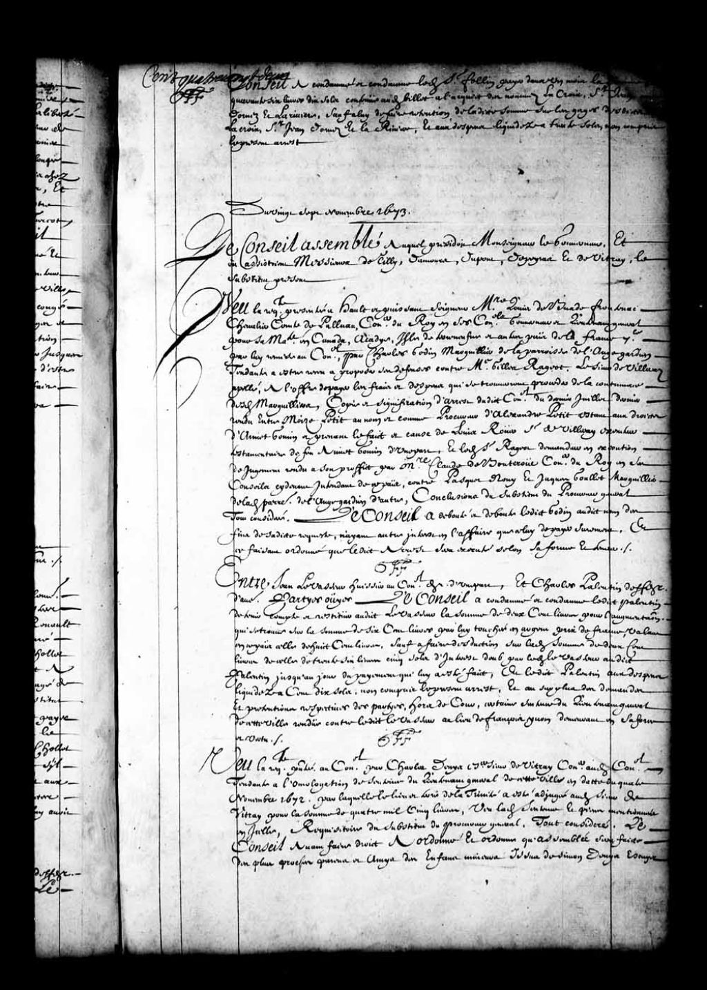 - Transcription du texte avec orthographe modernisée : «Du vingt-sept novembre 1673. Le Conseil assemblé auquel présidait Monseigneur le gouverneur, et où assistaient Messieurs de Tilly, Damours, Dupont, Depeiras et de Vitray, le substitut présent. Vu la requête présentée à haut et puissant seigneur messire Louis de Buade Frontenac, chevalier comte de Palluau, conseiller du Roi en ses Conseils gouverneur et lieutenant général pour sa Majesté en Canada, Acadie, île de Terre-Neuve et autres pays de la France septentrionale, par lui remise au Conseil, par Charles Godin marguillier de la paroisse de l'Ange-Gardien, tendante à être reçu à proposer ses défenses contre maître Gilles Rageot. Le sieur de Villeray appelé, à l'offre de payer les frais et dépens qui se trouveront procéder de la contumace desdits marguilliers; copie et signification d'arrêt dudit Conseil du dernier juillet dernier, rendu entre Moïse Petit au nom et comme procureur de [...]