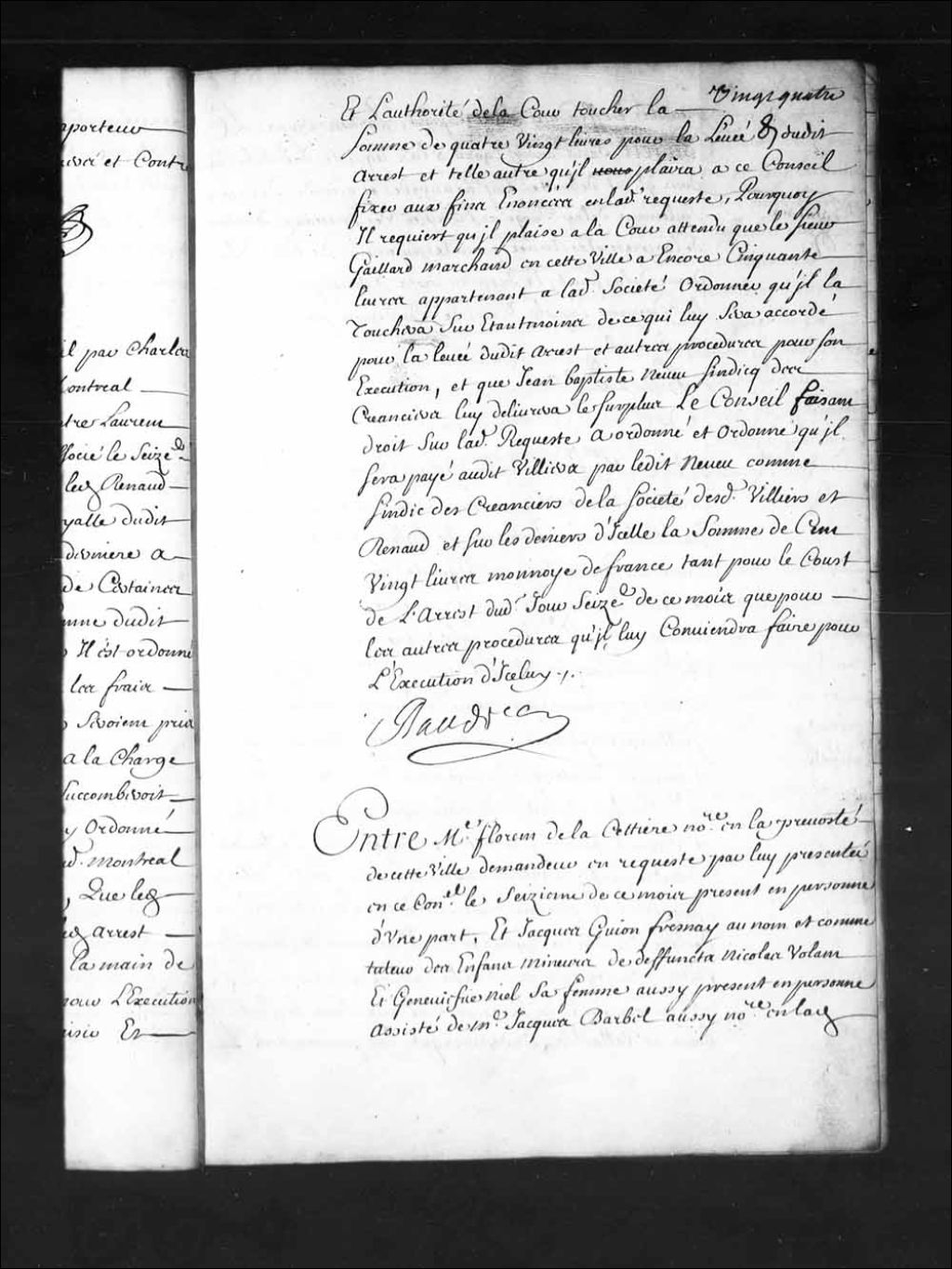 - Transcription du texte avec orthographe modernisée : «Entre maître Florent de LACETTIERE (Lacetière) notaire en la prévôté de cette ville demandeur en requête par lui présentée en ce Conseil le seizième de ce mois présent en personne d'une part, et Jacques GUION FRESNAY (Dufresnay) au nom et comme tuteur des enfants mineurs de défunts Nicolas Volant et Geneviève Niel sa femme aussi présent en personne assisté de maître Jacques Barbel aussi notaire en ladite prévôté défendeur d'autre part. Parties ouïes, le Conseil sans avoir égard à la requête dudit de LaCettière (Lacetière) dont il est débouté lui a accordé et accorde de grâce seulement délai jusqu'à l'arrivée des derniers vaisseaux de la présente année pour le payement du billet de la dame de Laforest, et jusqu'au mois d'août prochain pour les dépens desquels il a été condamné par arrêts de ce Conseil. RAUDOT.»