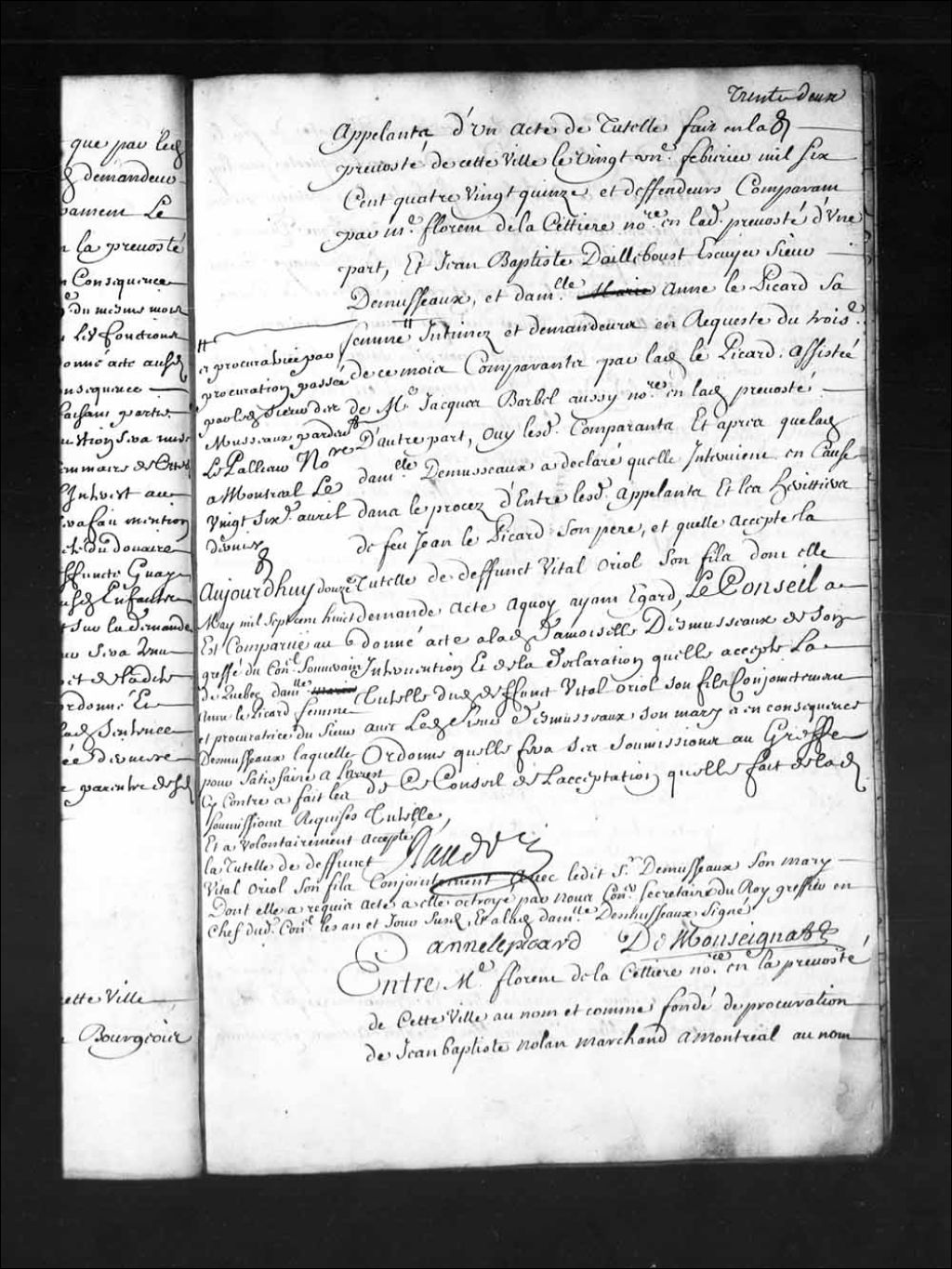 Comparution au greffe du Conseil de Anne Picard, femme et procuratrice de Jean-Baptiste d'Ailleboust, écuyer et sieur des Musseaux, relativement à l'arrêt du 7 mai 1708 concernant la tutelle de Vital Oriot (Auriot) son fils, qu'elle accepte, 12 mai 1708, Archives nationales à Québec, Fonds Conseil souverain, (03Q,TP1,S28,P8649).