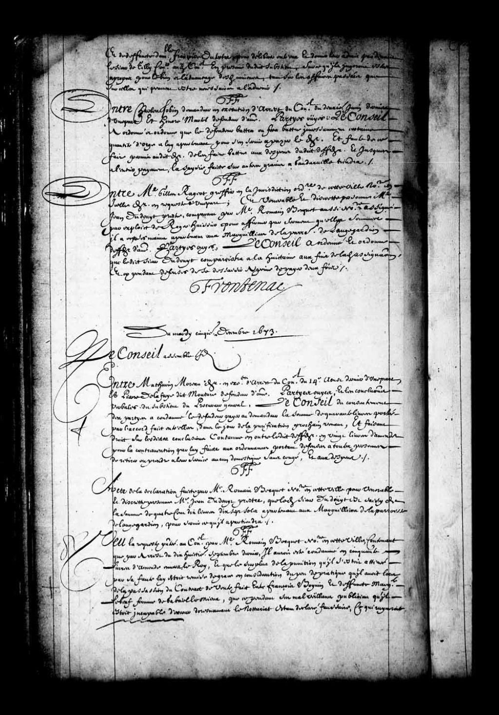 Transcription du texte avec orthographe modernisée : «Vu la requête présentée au Conseil par maître Romain Becquet notaire en cette ville contenant que par arrêt du dix-huitième septembre dernier, il aurait été condamné en cinquante livres d'amende envers le Roi, et que le surplus de la punition qu'il s'était attirée par sa faute lui étaient remise de grâce en considération du peu de pratique qu'il avait lors de la passation du contrat de vente faite entre François Boyvin (Boivin) et défunte Marguerite Lebeuf (Leboeuf) femme de Gabriel Lemieux, que cependant ses malveillant publiaient qu'il était incapable d'exercer dorénavant le notariat étant déclaré faussaire, ce qui ruinerait entièrement son honneur s'il n'y était pourvu, requérant qu'il soit ordonné que ledit arrêt, ensemble ladite amende ne porteront aucune note d'infamie contre lui, et le décharger de ladite amende en considération des services qu'il a rendus depuis pour sa Majesté ayant fait le rôle des familles de Québec et lieux circonvoisins, et qu'il lui est dû la somme de quarante et une livres dix sols suivant la taxe que en a été faite; état de ce qu'il a fait tant par l'ordre de messire Daniel de Rémy chevalier seigneur de Courcelle ci-devant gouverneur et lieutenant général pour sa Majesté en ce pays, que du Conseil; et que par celui de messire Jean Talon conseiller de sa Majesté en ses Conseils d'état et privé, ci-devant intendant de ce pays, au bas duquel est la taxe qui en aurait été faite au Conseil à la somme de quarante et une livres dix sols, en date du vingt-deuxième octobre 1669. Conclusions verbales du substitut du procureur général du Roi, tout considéré. Le Conseil exécutant son arrêt du dix-huitième septembre dernier et expliquant icelui, a ordonné et ordonne que ledit arrêt ne portera aucune note d'infamie audit Becquet, et faisant droit sur le surplus de ladite requête ordonne que compensation sera faite de la somme de cinquante livres d'amende en laquelle il aurait été condamné par ledit arrêt, avec ce qui lui est dû, tant par ladite taxe, que pour autres peines par lui prises cette année pour le recensement de la ville de Québec; défenses à toutes personnes de faire aucun reproche audit Becquet pour raison dudit arrêt. FF.»