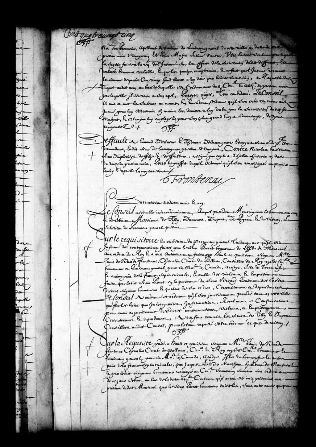 Transcription du texte avec orthographe modernisée : «Défaut à Edmond (Emond) DESUEVE et Thomas de LANOUGUERE écuyers sieurs de STE ANNE demandeurs ledit sieur de Lanouguere présent d'une part; contre Nicolas GATINEAU sieur Duplessys défendeur et défaillant assigné par exploit de Hébert huissier en date du douze du présent mois, pour le profit duquel ordonné qu'il sera réassigné au premier lundi d'après la mi-carême. FRONTENAC.»