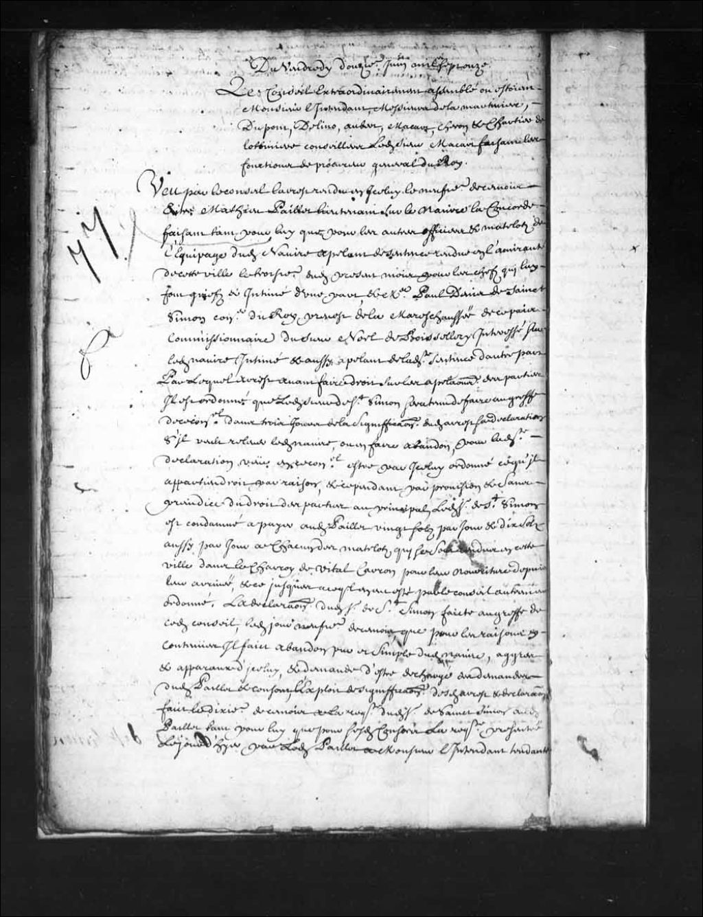 - Transcription du texte avec orthographe modernisée : «Du vendredi douzième juin mille sept cent onze. Le Conseil extraordinairement assemblé où étaient Monsieur l'intendant, Messieurs de la Martinière, Dupont, Delino (De Lino), Aubert, Macart (Macard), Cheron et Chartier de Lotbinière conseillers ledit sieur Macart (Macard) faisant les fonctions de procureur général du Roi. Vu par le Conseil l'arrêt rendu en icelui le neuvième de ce mois entre Mathieu Paillet lieutenant sur le navire la concorde faisant tant pour lui que pour les autres officiers et matelots de l'équipage dudit navire appelant de sentence rendue en l'amirauté de cette ville le troisième dudit présent mois pour les chefs qui lui font griefs et intimé d'une part, et maître Paul Denys (Denis) de Saint-Simon conseiller du Roi prévôt de la maréchaussée de ce pays commissionnaire du sieur Noël de Boissellery (Boissellerie) intéressé sur ledit navire intimé et aussi appelant [...]