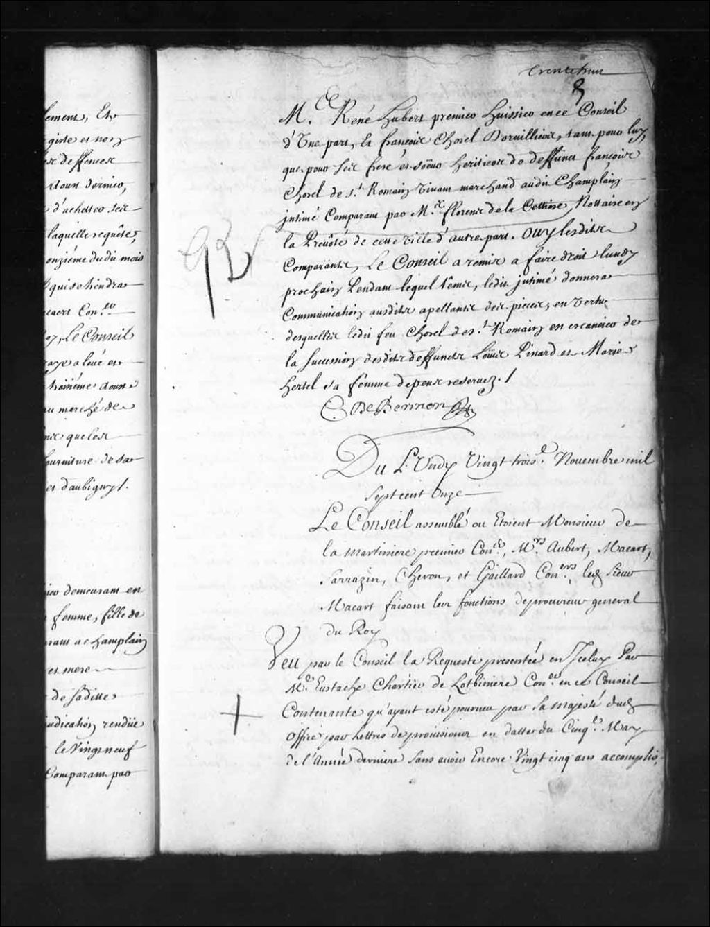 - Transcription du texte avec orthographe modernisée : «Du lundi vingt-troisième novembre mille sept cent onze. Le Conseil assemblé où étaient Monsieur de la Martinière premier conseiller, Messieurs Aubert, Macart (Macard), Sarrazin, Cheron, et Gaillard conseillers ledit sieur Macart (Macard) faisant les fonctions de procureur général du Roi. Vu par le Conseil la requête présentée en icelui par maître Eustache Chartier de Lotbinière conseiller en ce Conseil contenante qu'ayant été pourvu par sa majesté dudit office par lettres de provisions en date du cinquième mai de l'année dernière sans avoir encore vingt-cinq ans accomplis, sa Majesté lui aurait accordé des lettres de dispense d'âge, pour être reçu en ce dit Conseil, requérant qu'il plaise à la Cour le recevoir audit office de conseiller, arrêt rendu en ce Conseil le sixième de ce mois par lequel il est ordonné que lesdites lettres de dispense d'âge accordées par sa majesté audit [...]