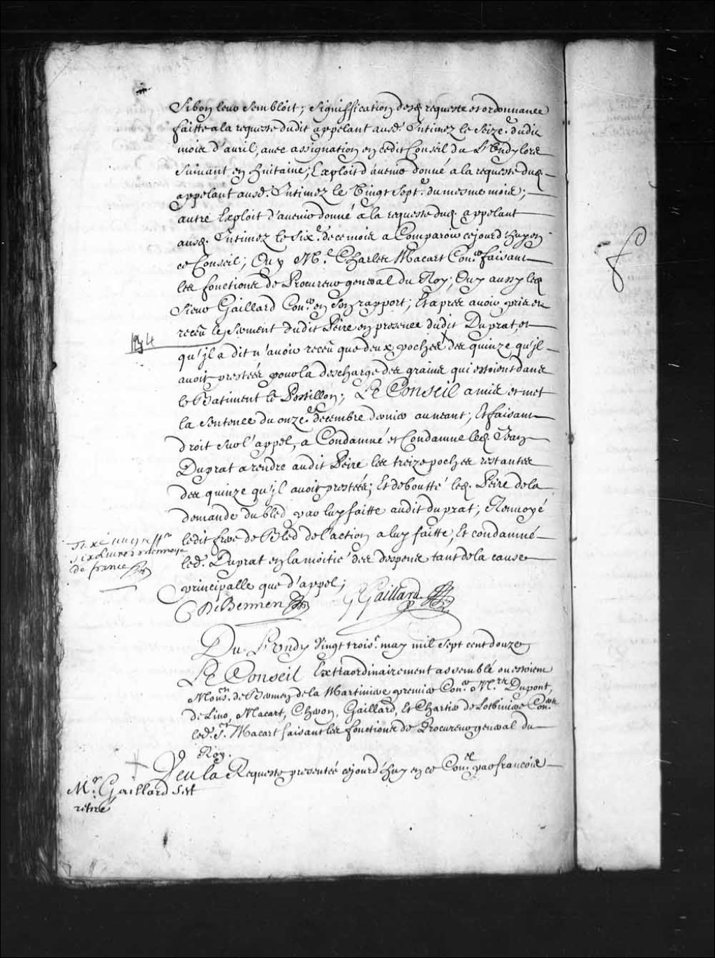 - Transcription du texte avec orthographe modernisée : «Du lundi vingt-troisième mai mille sept cent douze. Le Conseil extraordinairement assemblé où étaient Monsieur de Bermen de la Martinière premier conseiller Messieurs Dupont, Delino (De Lino), Macart (Macard), Cheron, Gaillard, et Chartier de Lotbinière conseillers ledit sieur Macart (Macard) faisant les fonctions de procureur général du Roi. Monsieur Gaillard s'est retiré. Vu la requête présentée ce jourd'hui en ce Conseil par François Babie (Baby) Chesneville tant en son nom comme fondé de pouvoir sous Seing privé de Raymond Babie (Baby) son frère, Madeleine Babie (Baby) femme de Jean-Baptiste Crevier Descheneaux son mari, et encore comme fondée de pouvoir de Pierre Babie (Baby) son frère demeurants à Saint-François; tendante entre autres choses à ce que depuis plusieurs années, Jacques Babie (Baby) leur frère et leur tuteur les a amusé sans leur rendre compte des biens de la communauté de défunt Jacques Babie (Baby) leur père, et de défunte Jeanne Dandonneau leur mère, ayant fait entendre qu'il avait mis toutes les pièces entre les mains de maître Louis Chambalon notaire en la prévôté de cette ville pour dresser lesdits comptes, néanmoins ils ont appris les jours derniers que ledit Chambalon était procureur des créanciers de feue ladite Dandonneau leur mère, qu'il a envoyé deux huissiers de cette ville saisir tous les biens dudit Babie (Baby), en vertu d'un arrêt de ce Conseil du deuxième de ce mois, à la requête de David Pauperet se disant créancier de ladite Dandonneau, et duquel il est procureur; pourquoi les suppliants s'opposent simplement à la délivrance des deniers provenants de la vente desdits biens; ainsi qu'il est plus au long contenu en ladite requête; requérant qu'il plaise à la Cour s'évoquer le fond principal de la cause en question; ce faisant les relever de l'omission qu'ils ont faite dans leur dit opposition de demander les meubles à eux appartenants qui sont en nature, les recevoir opposants à l'exécution de l'arrêt du deuxième de ce mois; et de l'ordonnance de Monsieur de la Martinière; ensemble des saisies et exécution faites en conséquence, et partie intervenante au procès, leur permettre de faire assigner en ce Conseil ledit Jacques Babie (Baby) pour se voir condamner de leur rendre compte incessamment et de leur remettre entre les mains toutes les pièces justificatives d'icelui pour ensuite liquider leurs droits envers et contre tous sauf audit Babie (Baby) à se pourvoir contre ledit Chambalon ainsi qu'il avisera bon être; ladite requête signée F. Babie (Baby) et Madeleine Babie (Baby) ouï maître Charles Macart (Macard) conseiller faisant les fonctions de procureur général du Roi; le Conseil avant faire droit sur ladite requête, a ordonné et ordonne qu'elle sera communiquée tant audit Jacques Babie (Baby) leur frère et tuteur qu'aux créanciers de défunts Jacques Babie (Baby) et Jeanne Dandonneau leurs père et mère pour ensuite être ordonné ce qu'il appartiendra par raison. C. DE BERMEN»