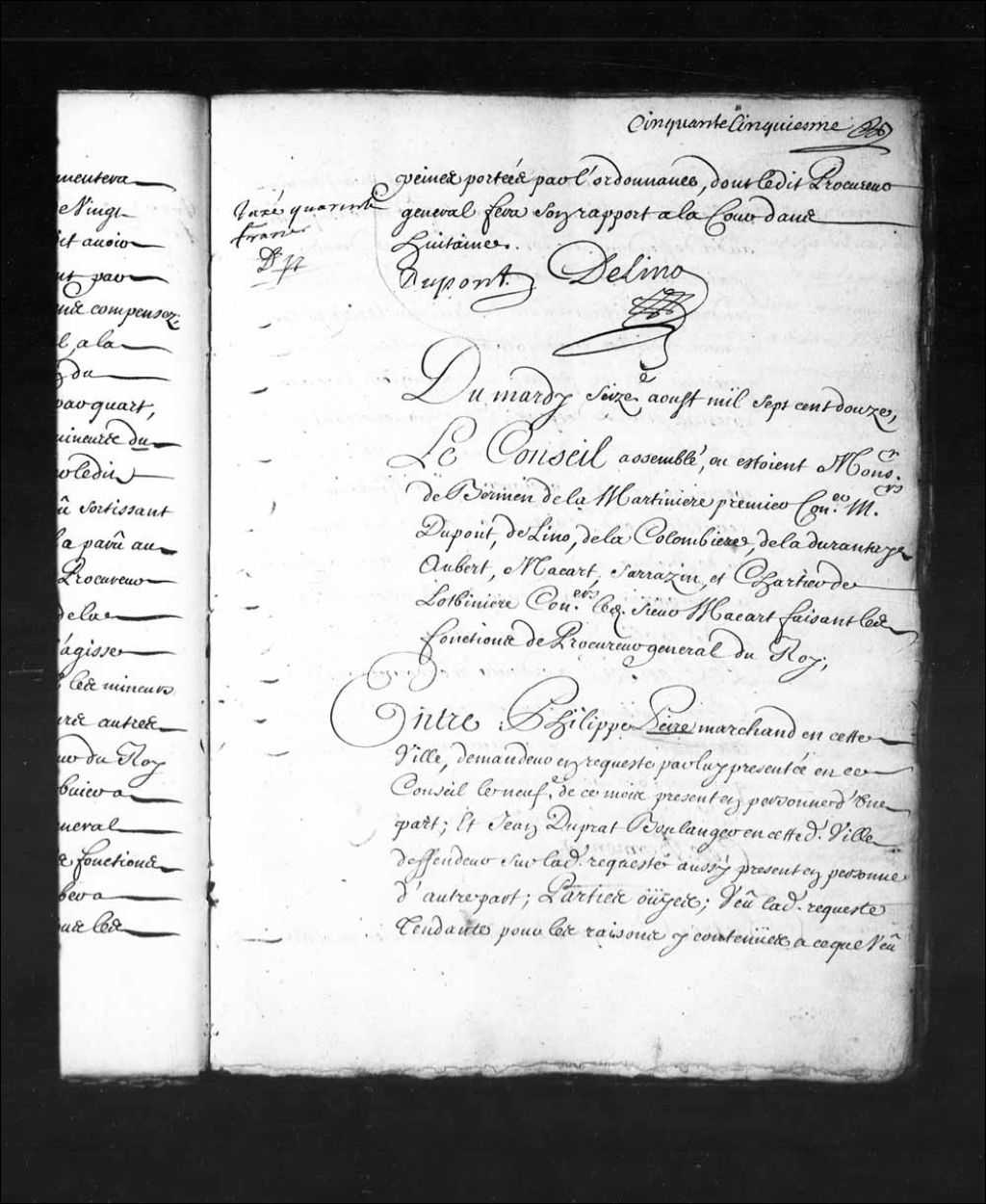 - Transcription du texte avec orthographe modernisée : «Du mardi seizième août mille sept cent douze. Le Conseil assemblé, où étaient Monsieur de Bermen de la Martinière premier conseiller Messieurs Dupont, Delino (De Lino), de la Colombière, de Ladurantaye, Aubert, Macart (Macard), Sarrazin, et Chartier de Lotbinière conseillers ledit sieur Macart (Macard) faisant les fonctions de procureur général du Roi. Entre Philippe PEIRE marchand en cette ville, demandeur en requête par lui présentée en ce Conseil le neuvième de ce mois présent en personne d'une part; et Jean DUPRAT boulanger en cette dite ville défendeur sur ladite requête aussi présent en personne d'autre part. Parties ouïes; vu ladite requête tendante pour les raisons y contenues à ce que vu l'arrêt rendu en ce Conseil le neuvième mai dernier et l'exploit de commandement fait en conséquence audit défendeur, le septième juillet aussi dernier, il plaise à la Cour condamner icelui [...]