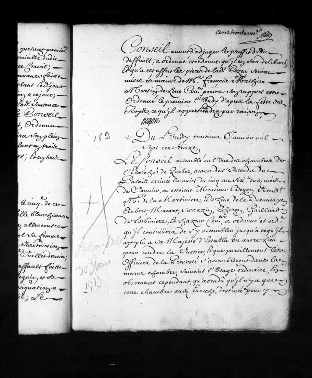 - Transcription du texte avec orthographe modernisée : «Du lundi trentième janvier mille sept cent treize. Le Conseil assemblé en l'une des chambres de l'évêché de Québec, à cause de l'incendie du palais [Palais de l'intendant] arrivée la nuit du cinq au sixième dudit mois de janvier, où étaient Monsieur Begon intendant Messieurs de la Martinière, Delino (De Lino), de Ladurantaye, Aubert, Macart (Macard), Sarrazin, Cheron, Gaillard de Lotbinière, et Hazeur conseillers, a ordonné et ordonne qu'il continuera de s'y assembler jusqu'à ce qu'il ait plu à sa Majesté d'établir un autre lieu pour rendre la justice, et que pareillement les officiers de la prévôté s'assembleront dans la même chambre, suivant l'usage ordinaire, en observant cependant, qu'attendu qu'il n'y a que cette chambre audit évêché, destinée pour y rendre la justice, ils ne s'y assembleront que le mercredi lorsque le Conseil s'y assemblera le mardi, auquel jour de mercredi les [...]