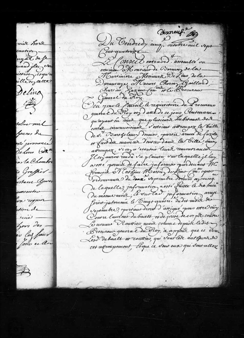 - Transcription du texte avec orthographe modernisée : «Du vendredi cinquième octobre mille sept cent quatorze. Le Conseil extraordinairement assemblé où étaient, Monsieur de Bermen de la Martinière, Messieurs Delino (De Lino), de Ladurantaye, Macart (Macard), Cheron, Gaillard, Chartier, Hazeur conseillers et le procureur général du Roi. Vu par le Conseil le réquisitoire du procureur général du Roi en date de ce jour, contenant qu'ayant eu avis que plusieurs habitants des côtes circonvoisines s'étaient attroupés, la veille de Saint-Barthélemy (Saint-Barthelémi) dernier, partie armée de fusils, et fait des menaces d'entrer dans la ville, ainsi attroupés, si on n'écoutait leurs remontrances, il en aurait rendu sa plainte sur laquelle il lui a été permis de faire informer par-devant Monsieur François Mathieu Martin Delino (De Lino) conseiller par ordonnance du deuxième septembre dernier, en conséquence de laquelle, information a été faite le [...]
