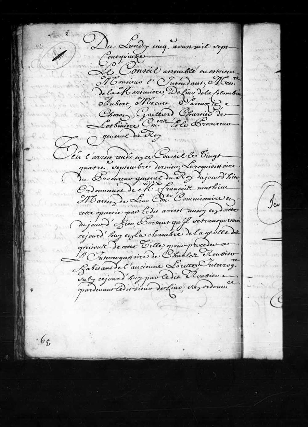 Transcription du texte avec orthographe modernisée : «Du lundi cinquième août mille sept cent quinze. Le Conseil assemblé où étaient Monsieur l'intendant; Messieurs de la Martinière, Delino (De Lino), de la Colombière, Aubert, Macart (Macard), Sarrazin, Cheron, Gaillard, Chartier de Lotbinière conseillers et le procureur général du Roi. Vu l'arrêt rendu en ce Conseil le vingt-quatrième septembre dernier; le réquisitoire du procureur général du Roi du jourd'hier; ordonnance de maître François Mathieu Martin Delino (De Lino) conseiller commissaire en cette partie par ledit arrêt aussi en date du jourd'hier, portant qu'il se transporterait ce jourd'hui en la chambre de la geôle des prisons de cette ville, pour procéder à l'interrogatoire de Charles Routtier (Routier, Routhier) habitant de l'ancienne Lorette; interrogatoire subi ce jourd'hui par ledit Routtier par-devant ledit sieur Delino (De Lino) ; son ordonnance de soit communiqué étant [...]