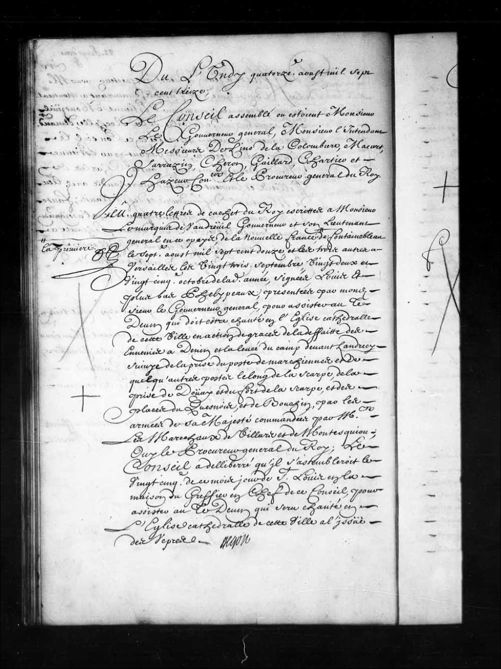 Transcription du texte avec orthographe modernisée : «Du lundi quatorzième août mille sept cent treize. Le Conseil assemblé où étaient Monsieur le gouverneur général, Monsieur l'intendant Messieurs Delino (De Lino), de la Colombière, Macart (Macard), Sarrazin, Cheron, Gaillard, Chartier et Hazeur conseillers et le procureur général du Roi. Vu quatre lettres de cachet du Roi écrites à Monsieur le marquis de Vaudreuil gouverneur et son lieutenant général en ce pays, de la Nouvelle-France; la première de Fontainebleau le septième août mille sept cent douze, et les trois autres à Versailles les vingt-trois septembre, vingt-deux et vingt-cinquième octobre de ladite année, signées Louis et plus bas Phelypeaux; présentées par mondit sieur le gouverneur général, pour assister au Te Deum qui doit être chanté en l'église cathédrale de cette ville en action de grâces de la défaite des ennemis a denin et la levée du camp devant Landrecy suivie de la prise du poste de Marchiennes et de quelque autres postes le long de la Scarpe, de la prise de Douay (Douai) et du fort de la Scarpe, et des places du Quesnois, et de Bouchin, par les armées de sa Majesté commandées par Messieurs les maréchaux de Villars et de Montesquiou; ouï le procureur général du Roi; le Conseil a délibéré qu'il s'assemblerait le vingt-cinquième de ce mois jour de Saint-Louis en la maison du greffier en chef de ce Conseil, pour assister au Te Deum qui sera chanté en l'église cathédrale de cette ville à l'issue des vêpres. BEGON.»