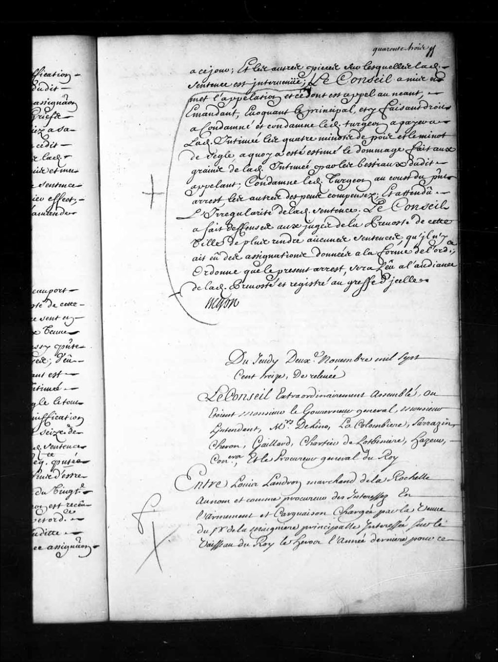 - Transcription du texte avec orthographe modernisée : «Du jeudi deuxième novembre mille sept cent treize, de relevée. Le Conseil extraordinairement assemblé, où étaient Monsieur le gouverneur général, Monsieur l'intendant, Messieurs Delino (De Lino), la Colombière, Sarrazin, Cheron, Gaillard, Chartier de Lotbinière, Hazeur, conseillers, et le procureur général du Roi. Entre Louis LANDRON marchand de La Rochelle au nom et comme procureur des intéressés en l'armement et cargaison chargée par la veuve du sieur de La Maignière principale intéressée sur le vaisseau du Roi le Héros l'année dernière pour ce pays, appelant de sentence rendue en la prévôté de cette ville le vingt-sixième octobre dernier d'une part, et Théophile PECLAVÉ DESBOIS, et Eustache DESGUERROUERE (Desguerrois) Desrosiers inspecteur et directeur de la cargaison dudit navire le Héros, aussi appelants de ladite sentence et de celle aussi rendue en ladite prévôté de cette [...]