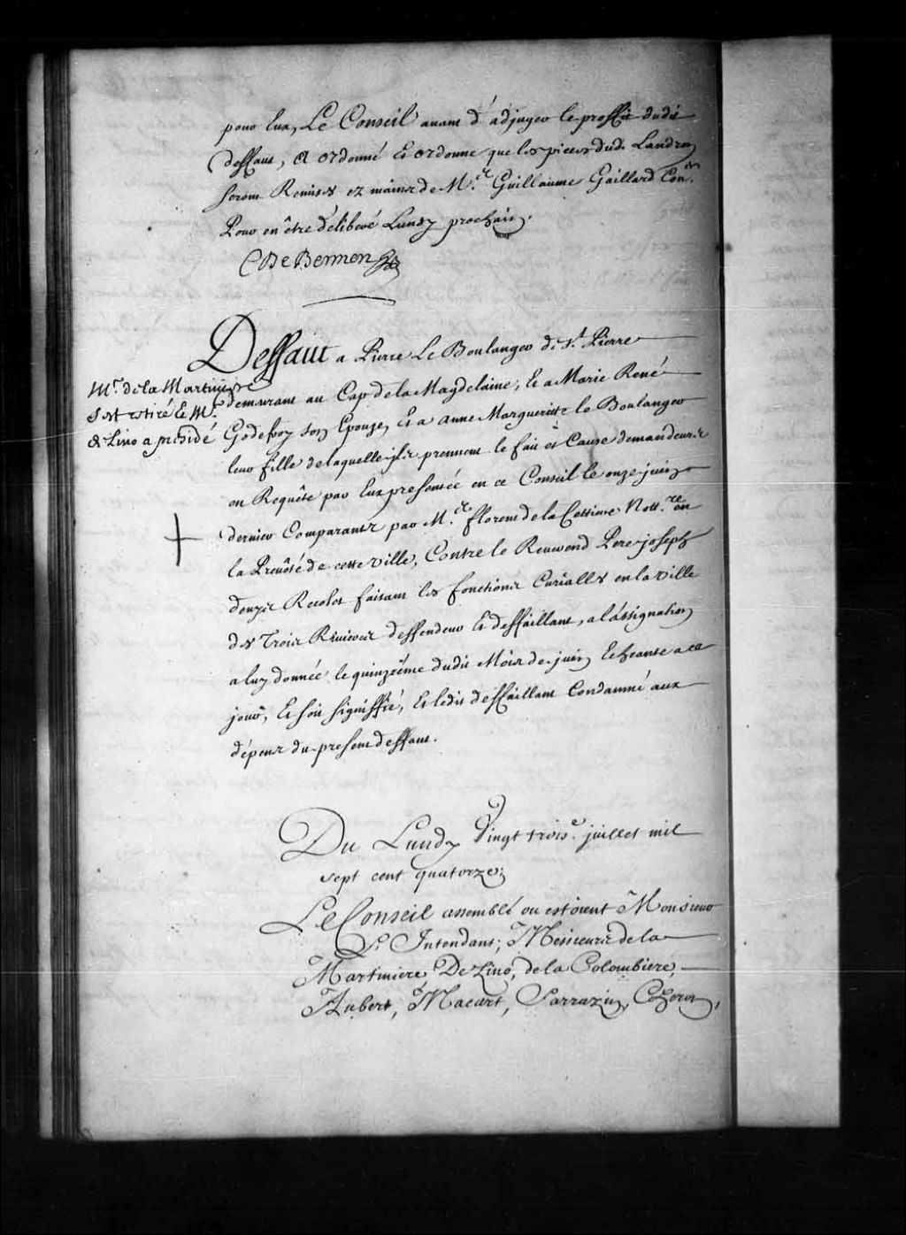 - Transcription du texte avec orthographe modernisée : «Du lundi vingt-troisième juillet mille sept cent quatorze. Le Conseil assemblé où étaient Monsieur l'intendant; Messieurs de la Martinière, Delino (De Lino), de la Colombière, Aubert, Macart (Macard), Sarrazin, Cheron, Gaillard, Chartier, et Hazeur conseillers et le procureur général du Roi. Vu la requête civile présentée ce jourd'hui en ce Conseil par Claude Saint-Olive apothicaire demeurant à Montréal, tendante pour les raisons y contenues, et pour n'avoir pas été appelé pour savoir s'il voulait ou non s'en rapporter au serment de Charles de Villiers marchand audit Montréal, lequel ayant été ordonné d'office n'est point décisif ni d'aucune considération; il plaise à la Cour accorder audit Saint-Olive lettres en forme de requête civile n'y ayant point de chancellerie en ce pays, et les parties se pouvant pourvoir en ce Conseil par simple requête, suivant la rédaction de l'ordonnance; ce faisant remettre les parties en même et semblable état qu'elles étaient avant l'arrêt rendu entre elles le trentième avril dernier; ordonner que ce dont a été appelé sortirait a effet, et renvoyer lesdites parties devant leur juge naturel qui n'a point encore jugé; sauf l'appel en définitive, et condamner ledit de Villiers en tous les dépens de son fol appel, et lui faire défenses d'exécuter ledit arrêt, qu'en donnant caution suivant l'ordonnance; vu aussi ledit arrêt et les autres pièces mentionnées en ladite requête; le Conseil a rejeté la requête dudit Saint-Olive; ordonne que son arrêt du trentième avril dernier, sera exécuté selon sa forme et teneur, sauf audit Saint-Olive à se pourvoir ainsi qu'il avisera au sujet du serment prêté par ledit de Villiers. BEGON.»